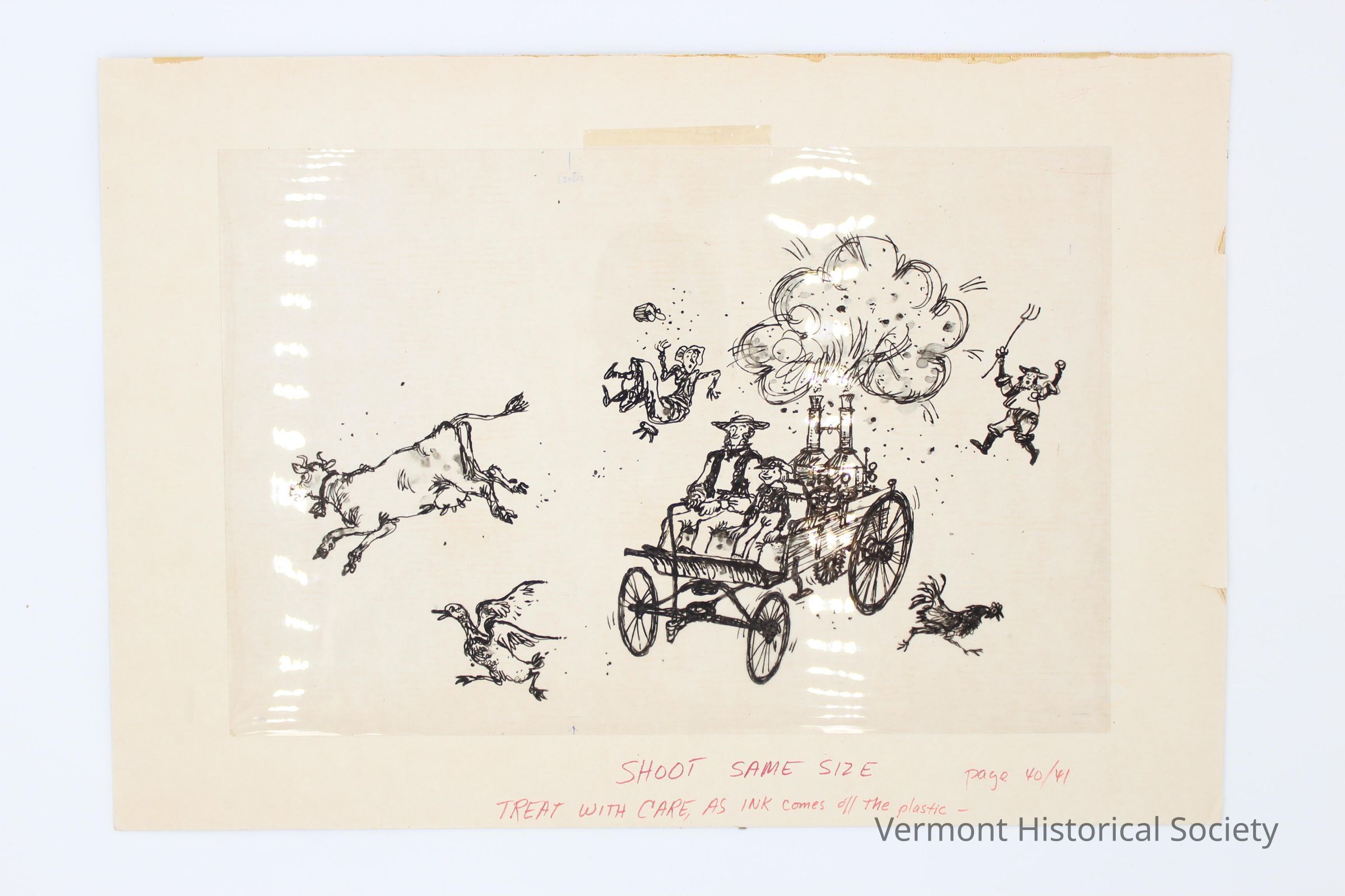 Drawing on clear plastic showing a man and young boy riding on a steam-powered wagon. Surrounding them are toppled and fleeing forms of a cow, a milkmaid, a duck, a chicken, and a farmer. The sheet is mounted onto cardboard with clear tape at the center top, and "SHOOT SAME SIZE/TREAT WITH CARE, AS INK comes off the plastic -/page 40/41" is written in red pencil beneath the artwork.Type of Drawing