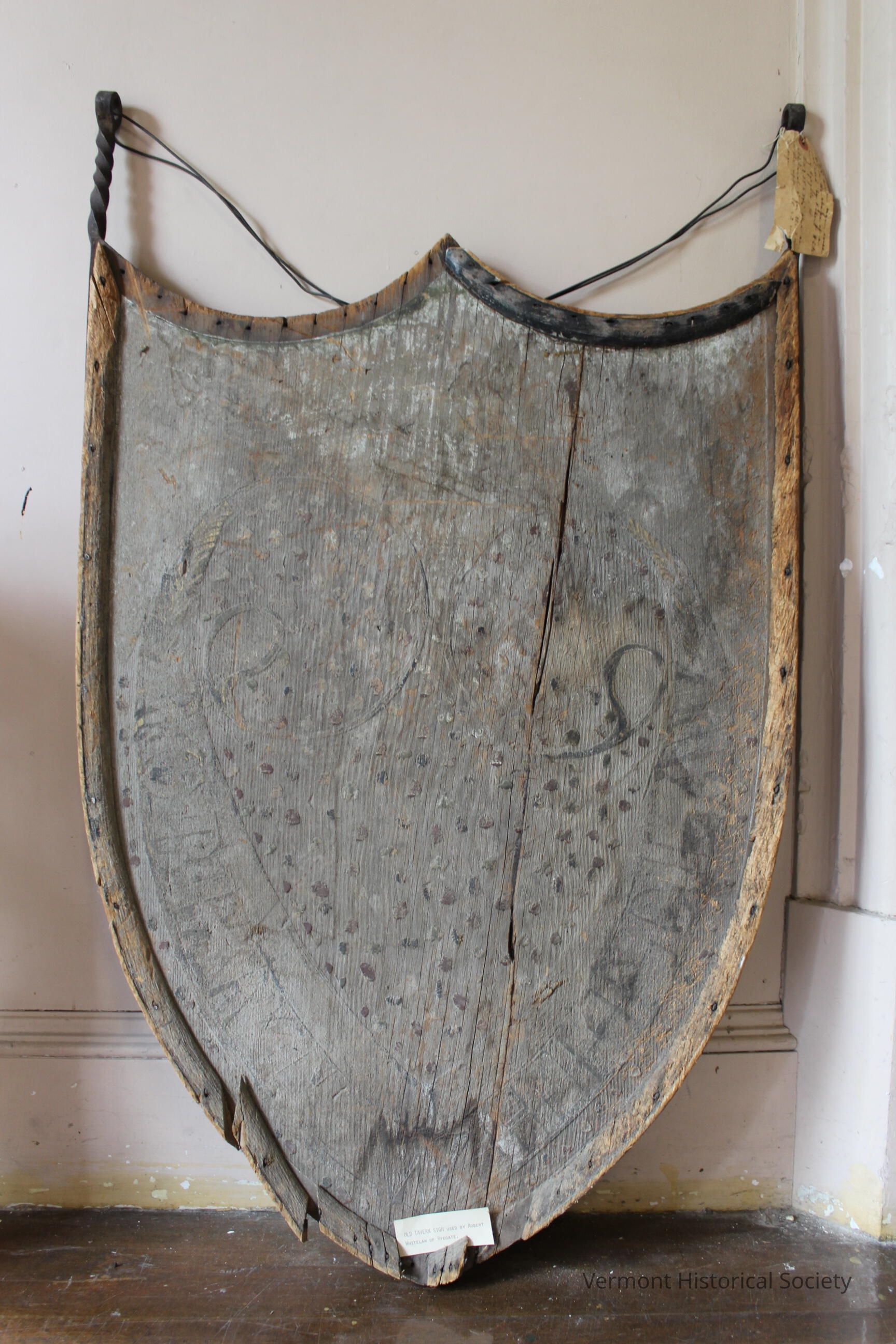 Shield-shaped trade sign with forged iron hanging eyes. Though all grey now, evidence of a painted design is present. The design consists of a scrolling banner with the words, "ROBERT WHITELAW", on it forming a heart around a dotted ground.