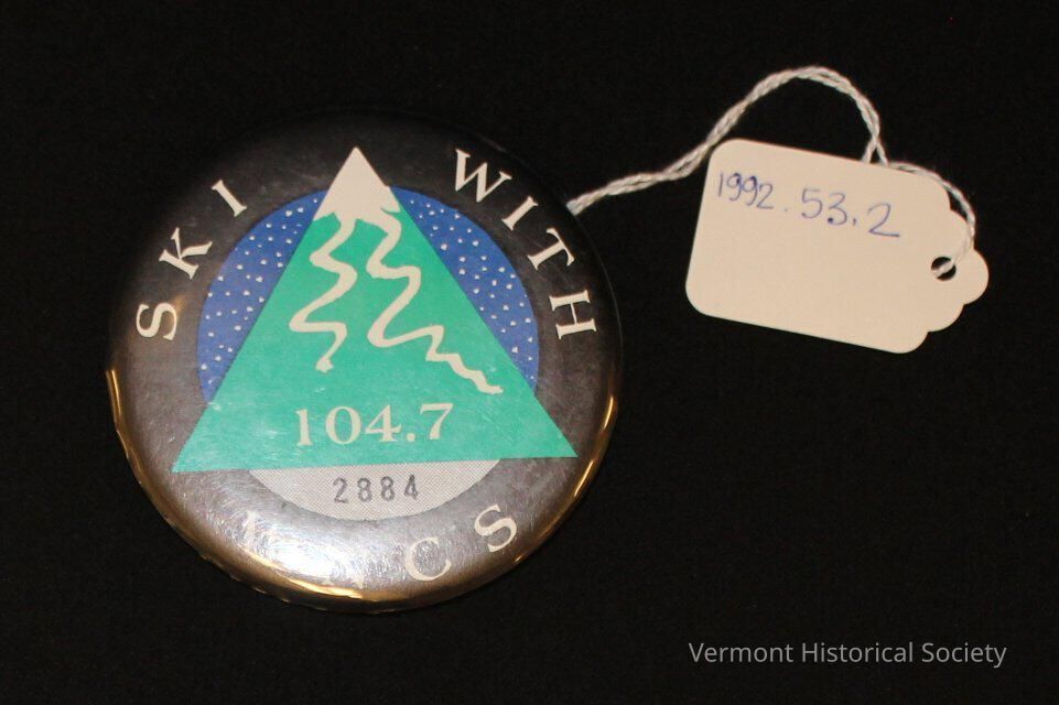 Round metal button printed with a green triangle in the center. The triangle, representing a mountain, has a white tip with meandering ski trails down the front. The number "104.7" is printed in white at the base. Beneath the mountain is the number 2884 in black. In a black border around the edge is the inscription, "SKI WITH WNCS".Context