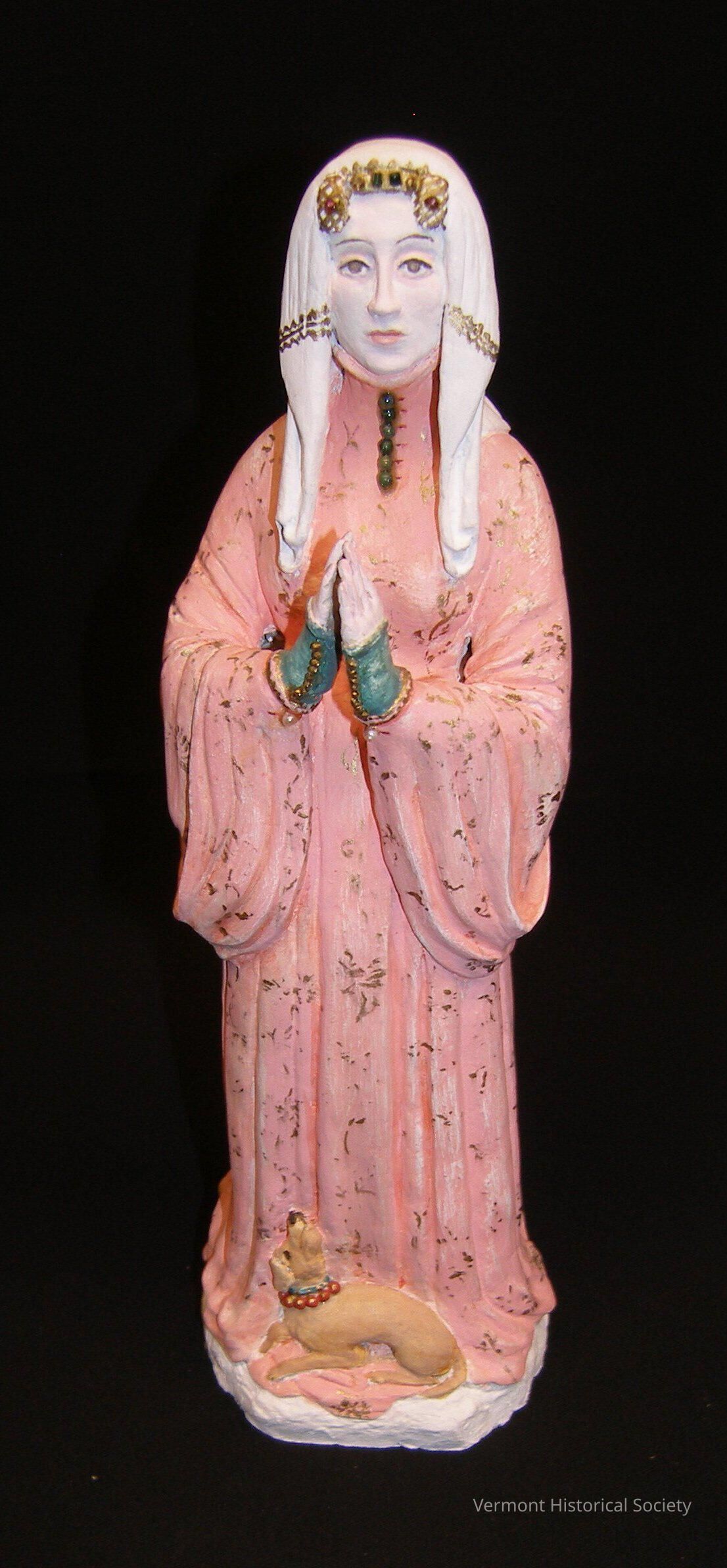 Female figure made of papier-mâché over a wire frame. She is shown wearing a white head covering and pink dress. There is a gold crown at her brow. Her dress has a high neckline with 6 buttons. Her diaphanous sleeves are gathered at her wrists, with short green cuffs or undersleeves covering her hands. There is a small dog at her feet.