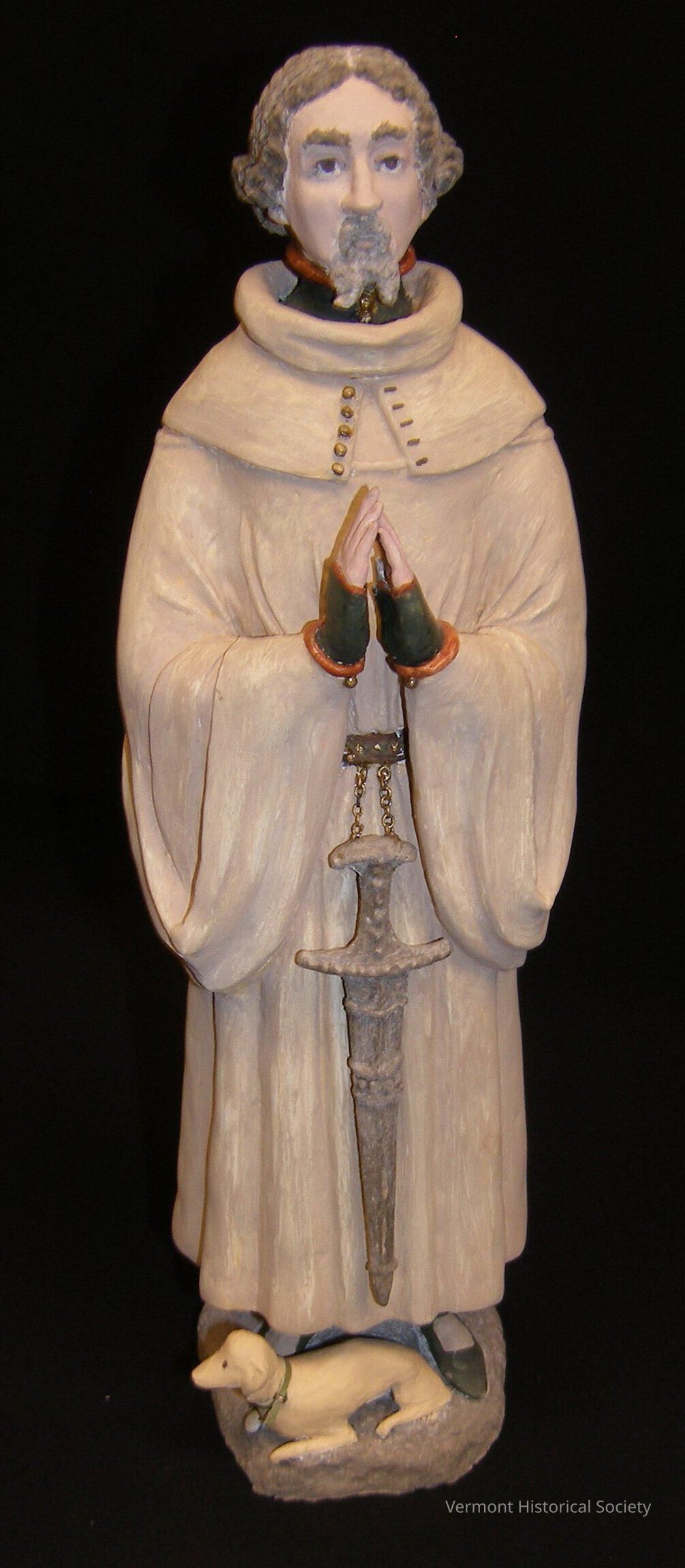 Male figure made of papier- mâché over a wire frame wearing a cream-colored houpeland or gown. His diaphanous sleeves are gathered at the wrists, and short green cuffs or undersleeves cover his hands. He is wearing a hood around his neck and shoulders, with 5 unbuttoned buttons. A high, green neckline is visible under the hood. He has short brown hair and double-pointed beard. A sword hangs from the center-front of a bent, and there is a small dog at his feet.Use