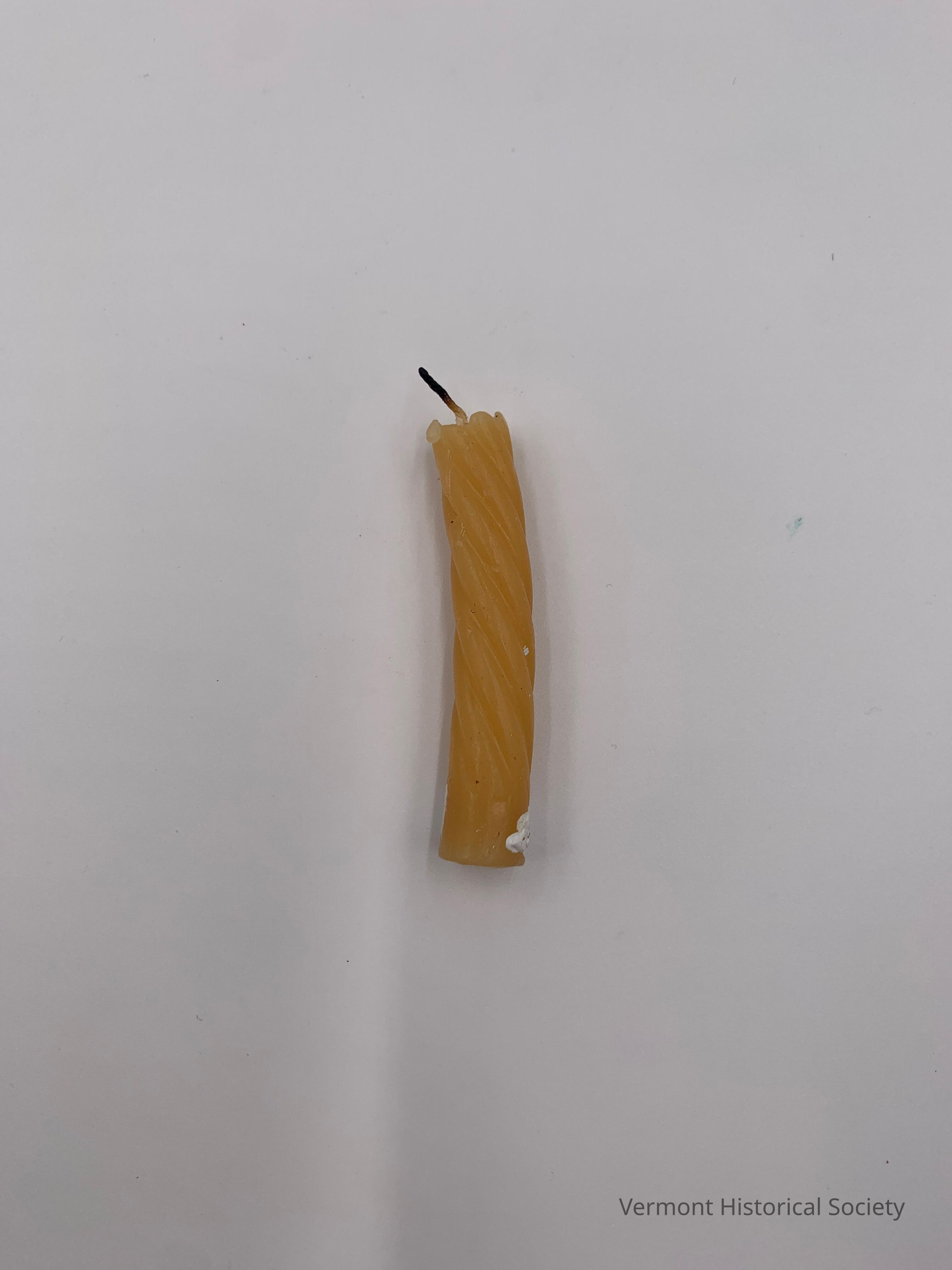 Partially burnt cream-colored wax candle molded with a swirled design.