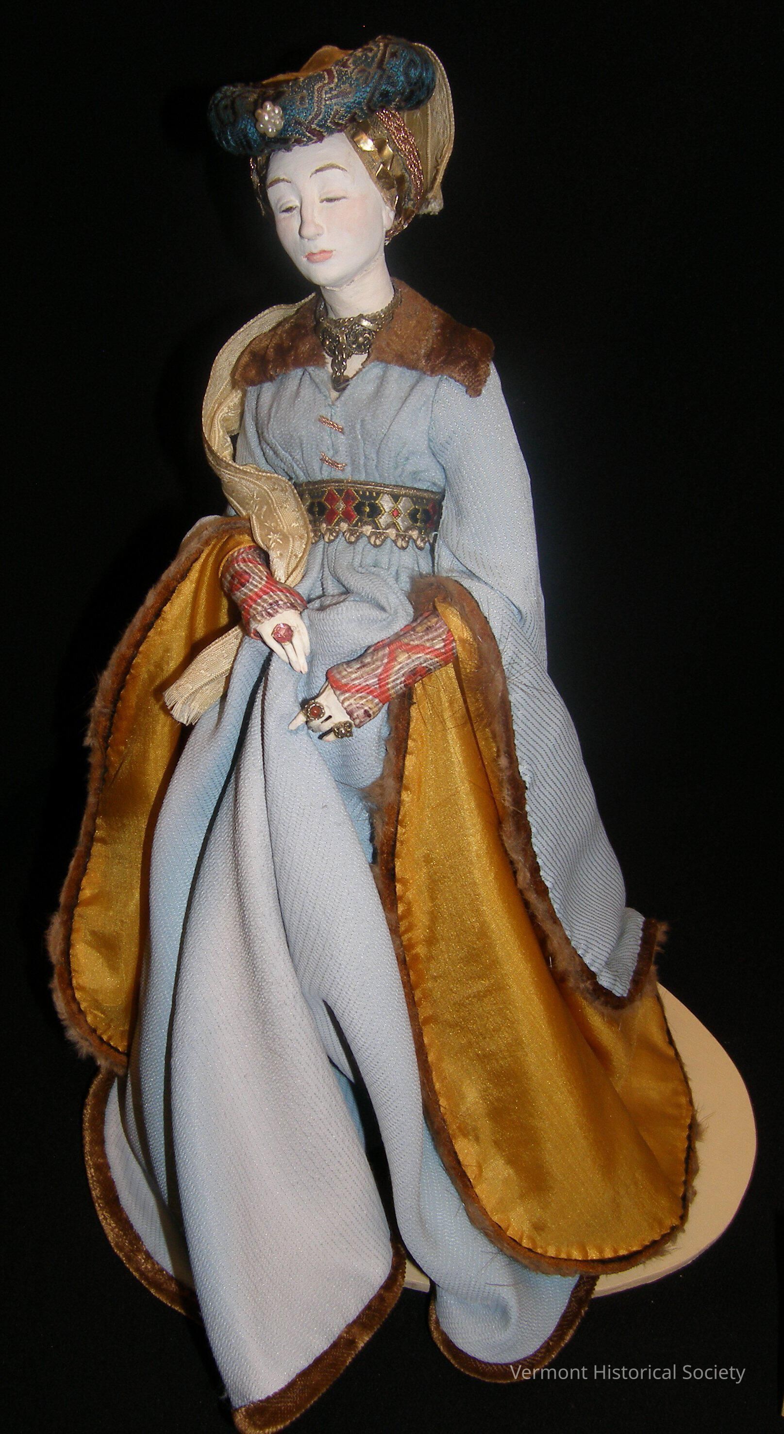 Female figure made of papier-mâché over a wire frame wearing a blue silk gown with wide bell sleeves lined with gold silk and trimmed with brown fur. There is a wide fur collar and faux-leather belt. The headdress consists of a padded ring and veil.