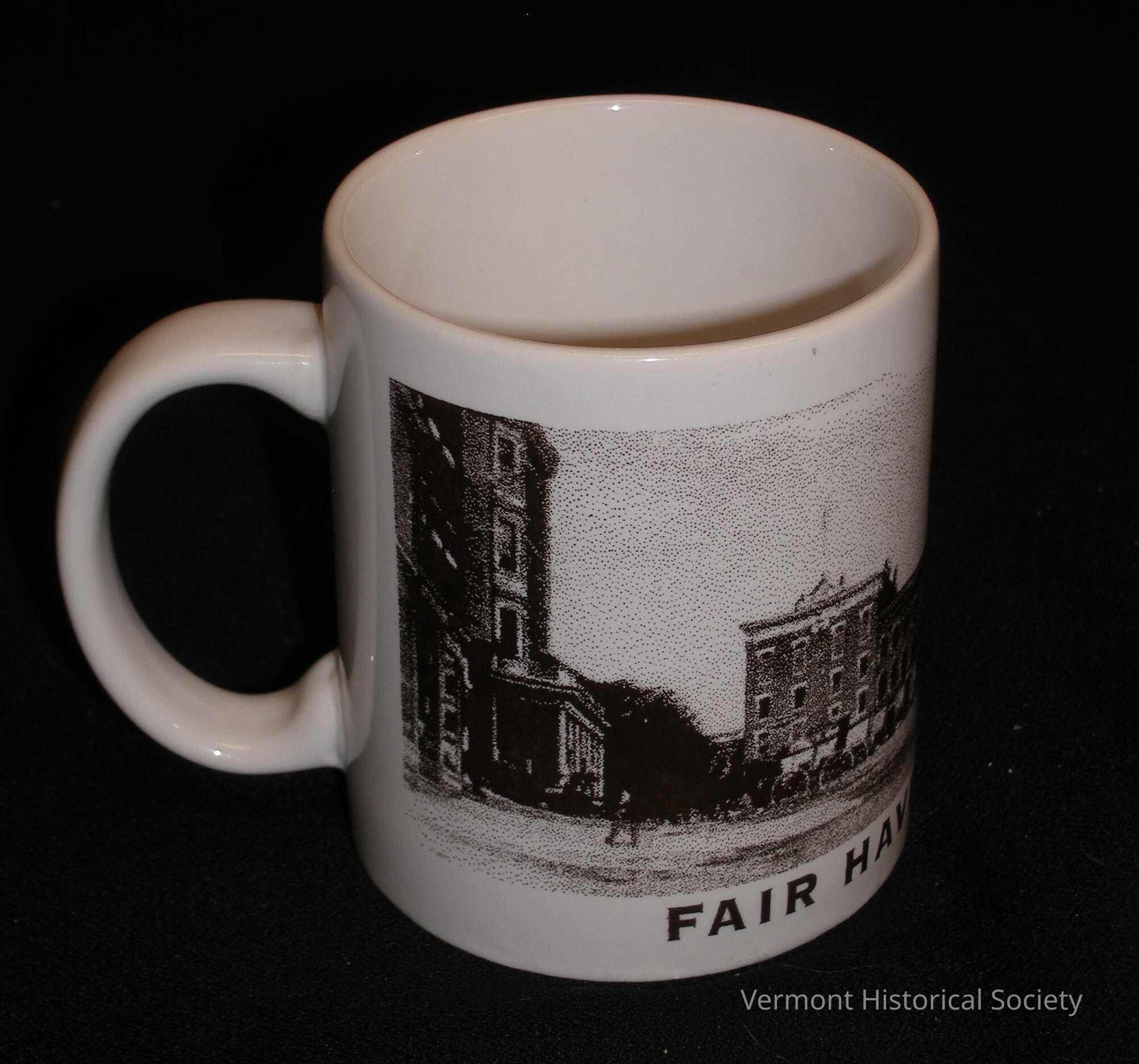 White ceramic mug printed with a black-and-white photograph of a street scene showing an early automobile. The image is labeled, "FAIR HAVEN, VERMONT".