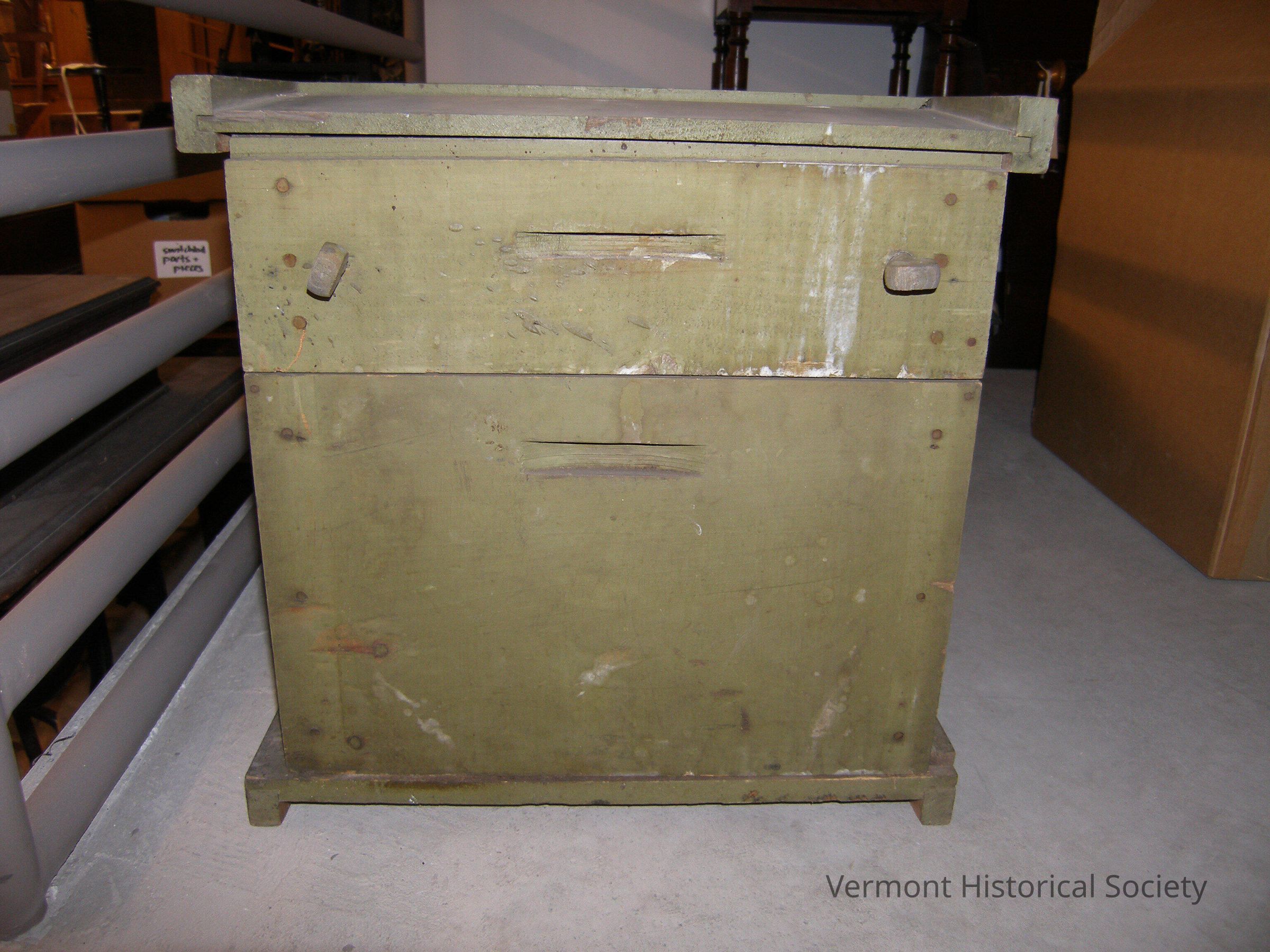 Green-painted wooden beehive. The have has 2 drawers: the top is shallow, taking up 1/4 of the hive, and the bottom is deep, taking up the rest of the hive. The top piece of the hive is removable. Inside, the hive is divided into several small, rectangular compartments using thin, interlocking wooden dividers.