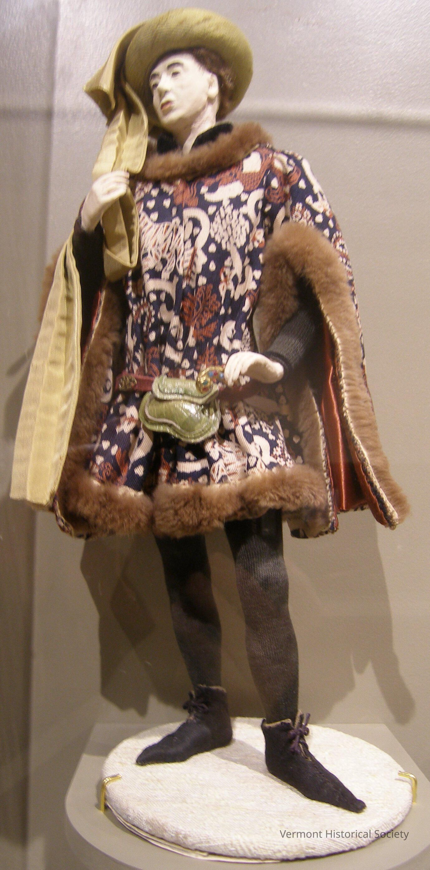 Male figure made of papier- mâché over a wire frame wearing a fur-trimmed tunic over black leggings. The tunic is printed with a abstract design in red and pink on a blue ground. There is a belt low at the hips with a pouch at the center front. A black collar and tight black undersleeves are visible. The shoes are made of black cloth and are very pointed. There is a headdress consisting of a padded ring with a long tail falling to the right. There is a round, fabric-covered base.
