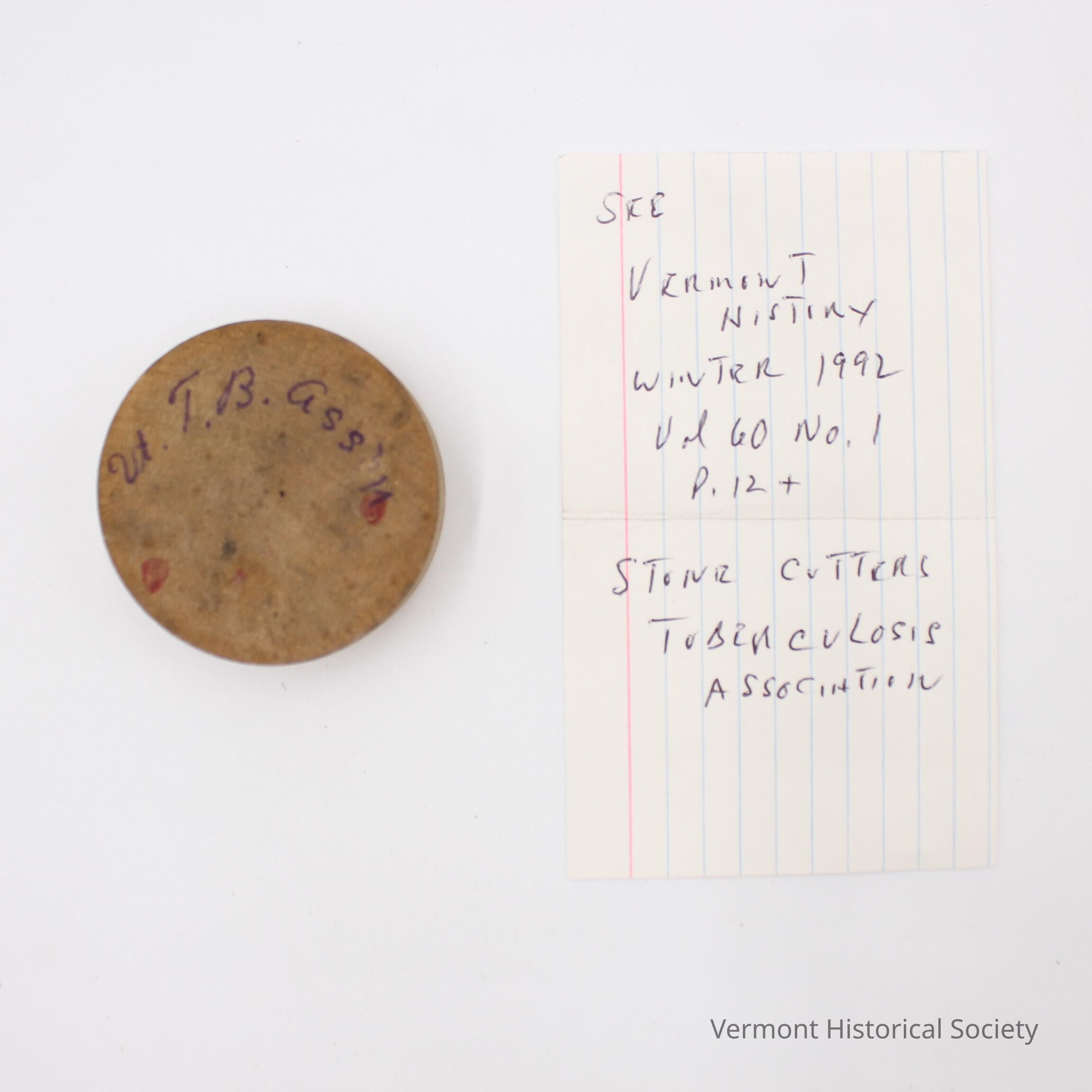 Small round wooden box. The top has the inked inscription, "2d. T.B. Ass."