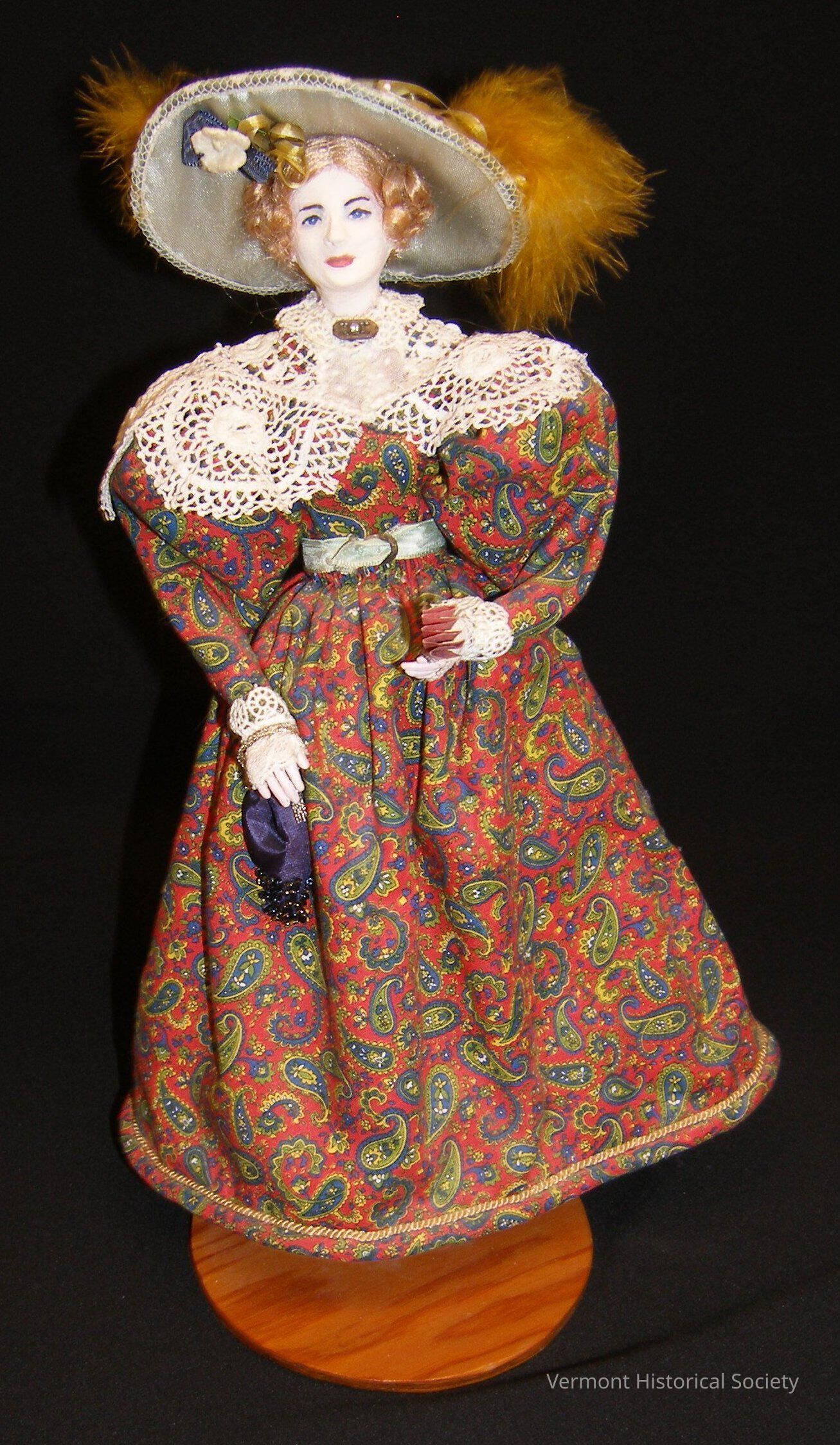Female figure made of papier-mâché over a wire frame wearing a red dress and green hat. The dress is made from red paisley-printed cotton. It has a wide skirt with a stuffed hem and wide, padded sleeves. There is a satin belt around her waist. She has a crocheted collar that covers the tops of her sleeves, and crocheted cuffs. The hat has a wide brim and is decorated with yellow feathers and ribbon. She is holding a blue reticule and red fan. There are black leather slippers trimmed with ribbon tying them to the ankles. Beneath the dress is a white cotton petticoat trimmed with lace. The figure is on a round, plywood base.Use