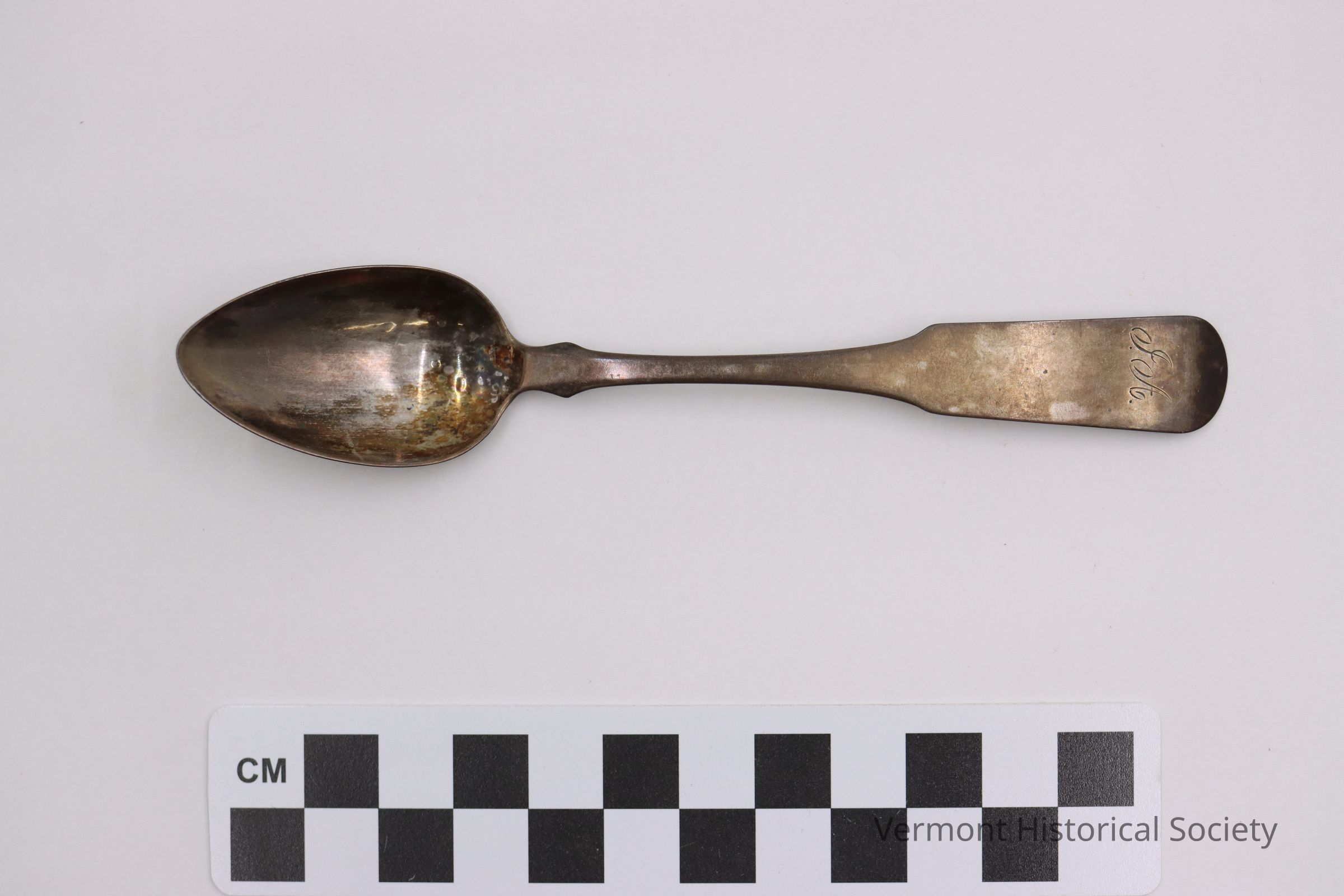Coin silver teaspoon with a slightly pointed bowl and pointed shoulders. The handle is engraved with the initials, "J.A." The back of the handle is marked "N. Harding".
