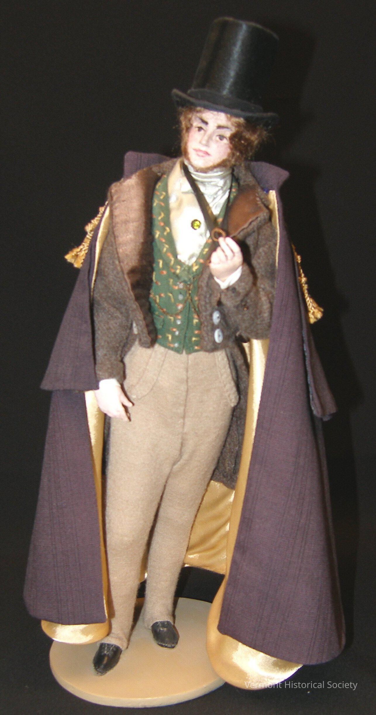 Male figure made of papier- mâché over a wire frame wearing tan trousers, a green vest, a white silk shirt, a brown wool jacket, and purple cloak. The cloak is lined with gold silk satin. He is wearing a high top hat over curly brown hair, and has a beard on the underside of his jaw. He is wearing black shoes and standing on a round, painted base.Use