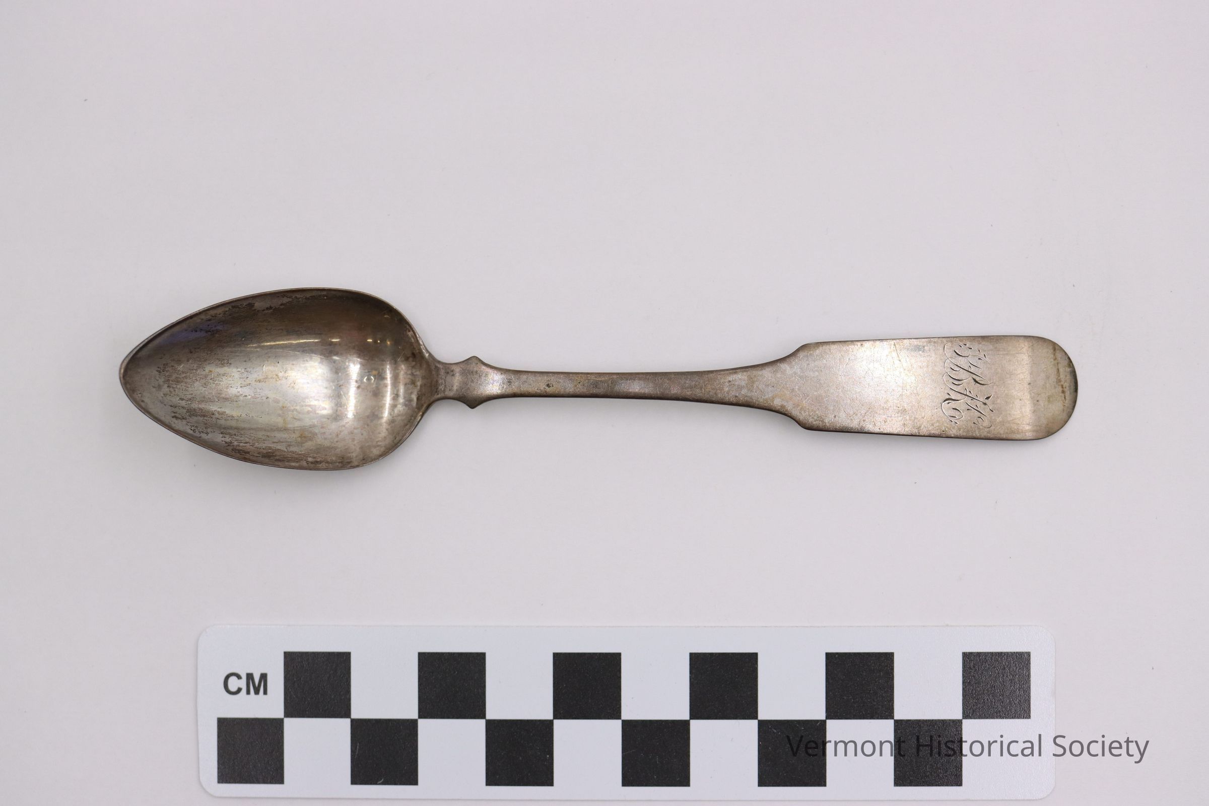 Coin silver teaspoon with a pointed bowl and pointed shoulder. The handle is engraved with the initials "BK". The back of the handle is marked, "I.GOODHUE".