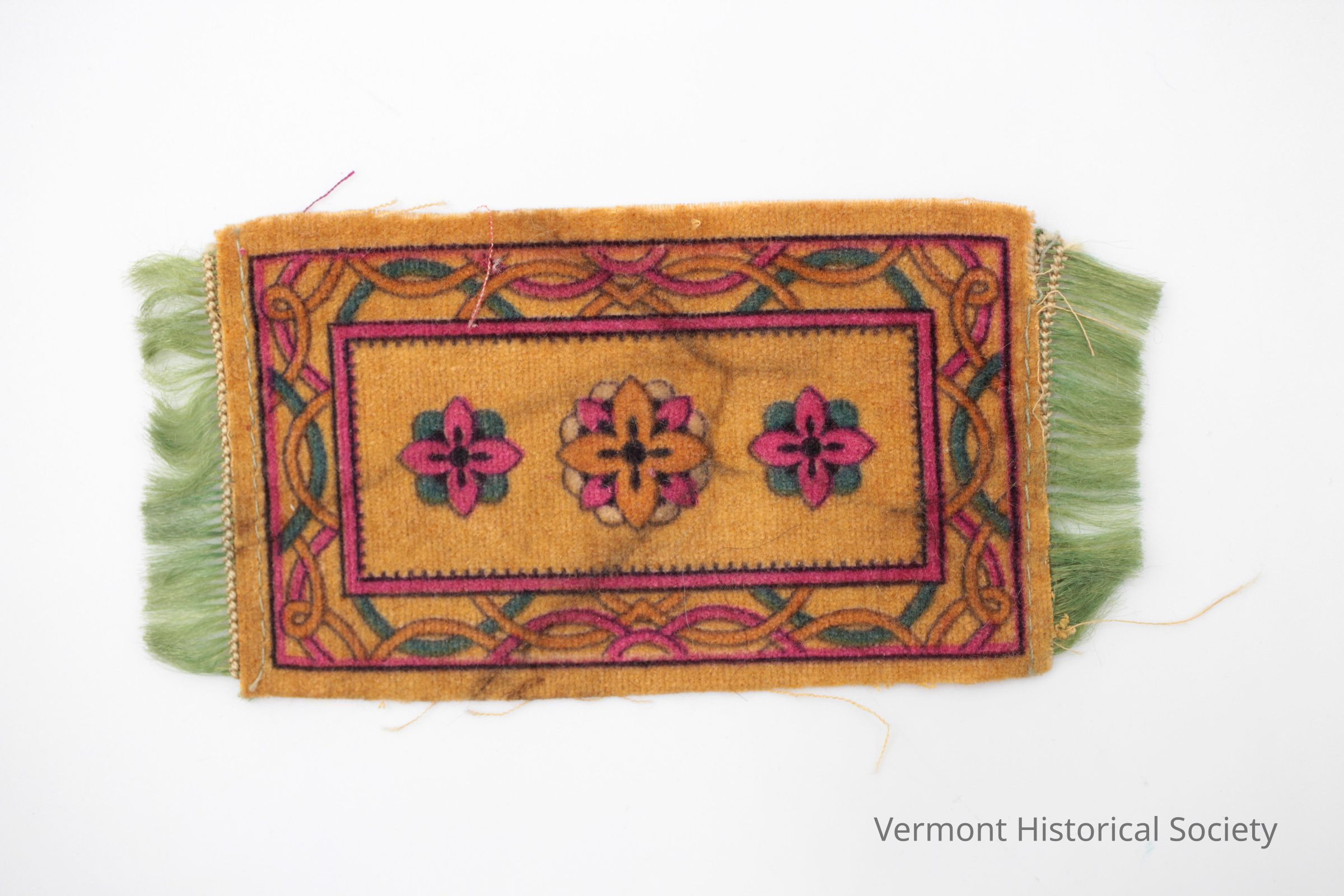 Miniature rug sized for a dollhouse. The rug is printed with an eastern-inspired design in yellow, pink, and blue with three central flowers. There is green fringe stitched to each short edge of the rug.Context