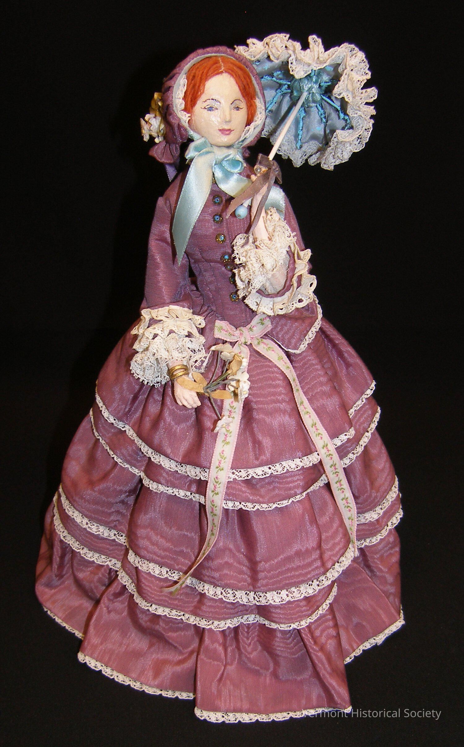 Female figure made of papier-mâché over a wire frame wearing a purple dress and purple bonnet. It has red wool hair under a "drawn" bonnet of purple silk that encircles the face and is tied under the chin with a light blue ribbon. The bonnet is trimmed with flowers and bows at the sides, and a bavolet at the back. The figure holds a small frilly lace parasol lined in light blue silk. The dress is purple moiré with a long bodice ending in front center. The skirt has five flounces edged with narrow lace. An ribbon bow with long streamers decorates the front of the dress. Sloping shoulders with long sleeves end in four rows of gathered lace. She wears gold bracelets and holds a bouquet of flowers. The figure stands on a plywood base with a label on the bottom that states the artist's name and date.Use