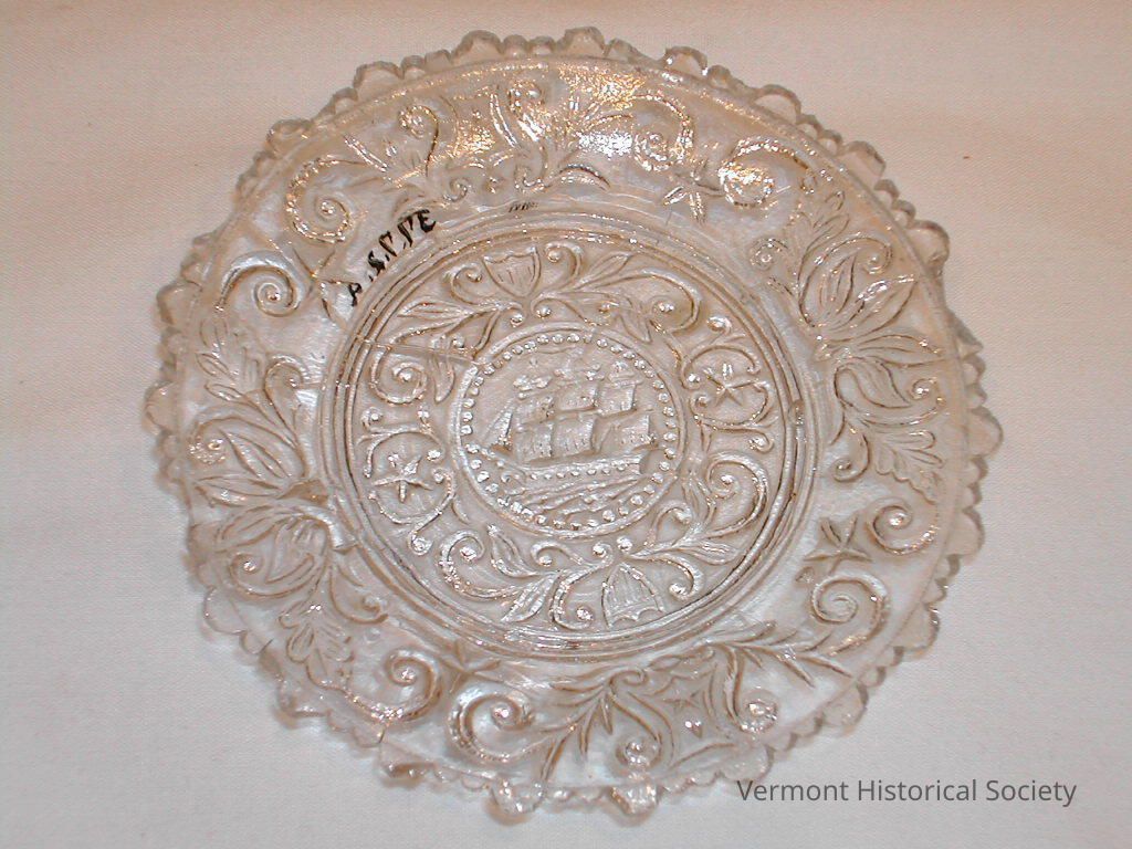 Pressed glass cup plate with a design of scrolls and stars impressed into the back. The center shows a three-masted sailing ship.