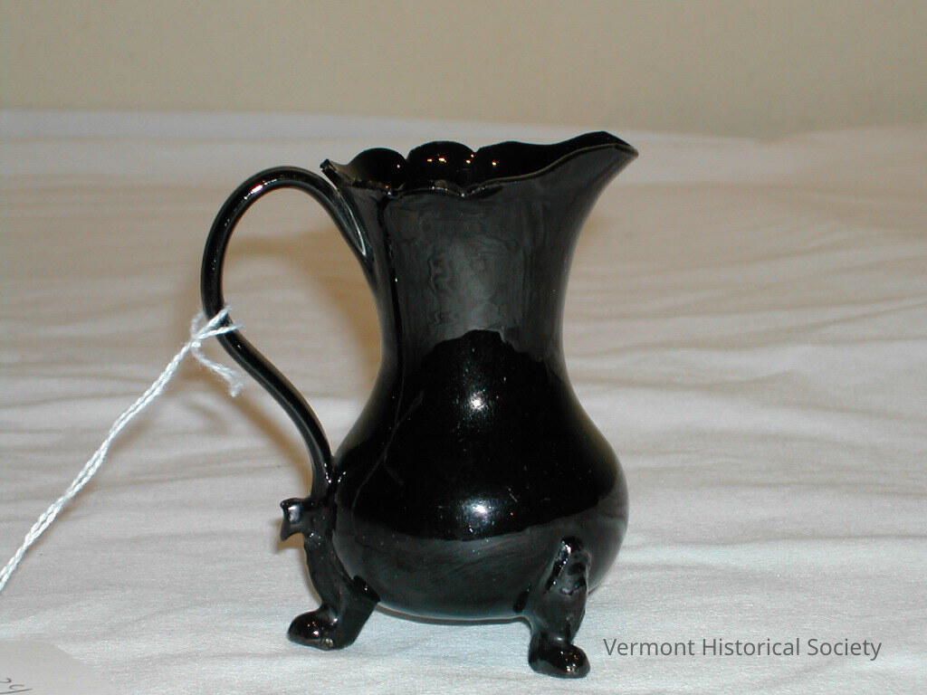 Small black luster cream pitcher. The pitcher has a bulbous body with three legs, and flares outward dramatically at the top. The top edge is scalloped and forms into a spout on one side. An ear-shaped handle spans from the top to one of the feet on the side opposite the spout.
