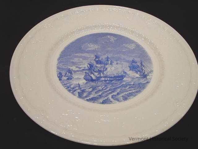 Large plate printed in the center well with a scene of several tall-masted ships at battle. The back is printed with a wreath formed up a vine, rope, chains, cannons, anchors, and cannon balls. Inside the wreath is the inscription, "THE BON HOMME RICHARD AND THE SERAPIS", followed by a long description of the event.Context