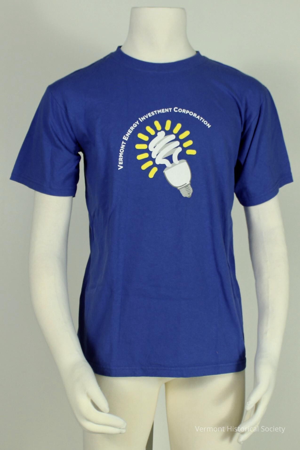 Blue t-shirt with an image of a CFL lightbulb at the center chest. The twisted bulb has 12 yellow lines emanating from it, and the inscription, "Vermont Energy Investment Corporation" arcs above the image. There is a tag at the back neckline that reads, "ANVIL/ Pre-Shrunk 100% cotton Made in Nicaragua M".