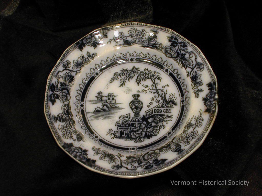 Transfer-printed cup showing an Eastern design in black. The center shows an urn near a fence with two pagodas in the background. The border consists of three repeats of a scene consisting of an urn beside a fence.