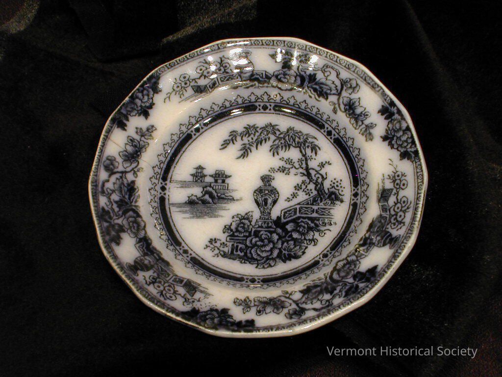 Transfer-printed cup showing an Eastern design in black. The center shows an urn near a fence with two pagodas in the background. The border consists of three repeats of a scene consisting of an urn beside a fence.