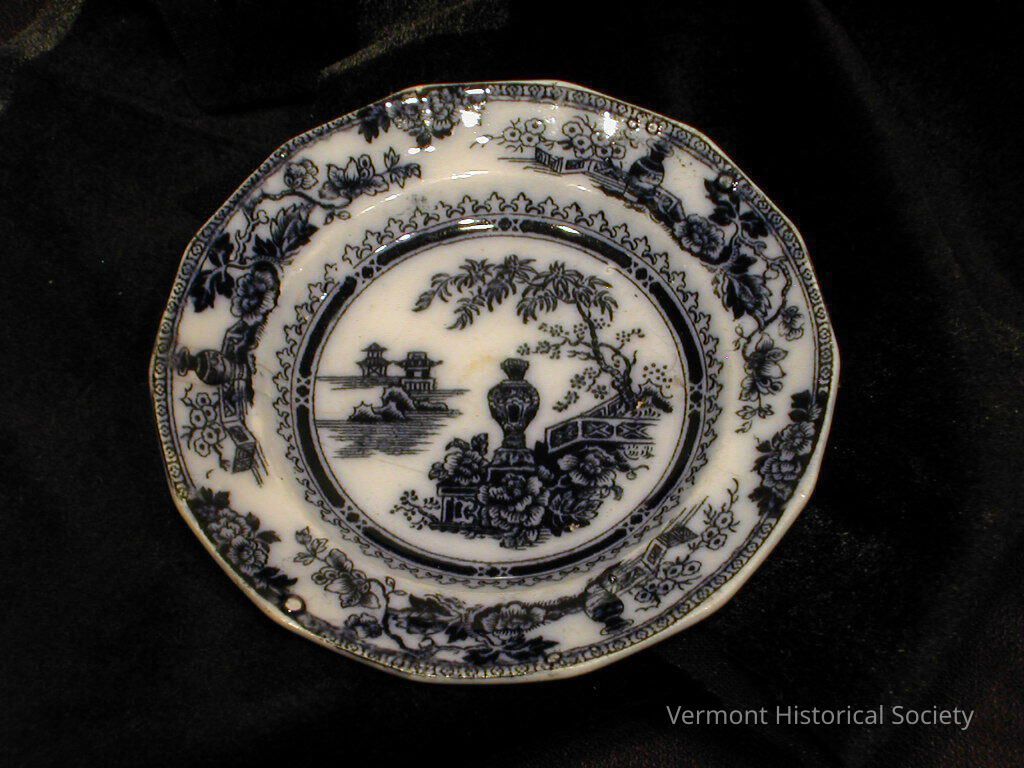 Transfer-printed cup showing an Eastern design in black. The center shows an urn near a fence with two pagodas in the background. The border consists of three repeats of a scene consisting of an urn beside a fence.