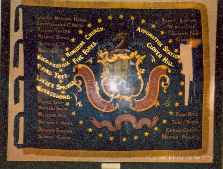 1st Vermont Cavalry regimental flag. It has a blue ground with the Vermont state seal painted at the center. Beneath the seal is a banner that reads "FIRST REGIMENT VERMONT CAVALRY". Surrounded the seal are the names of battles the regiment participated in. It has gold fringe on 3 sides, and 5 ribbon ties on the other edge.