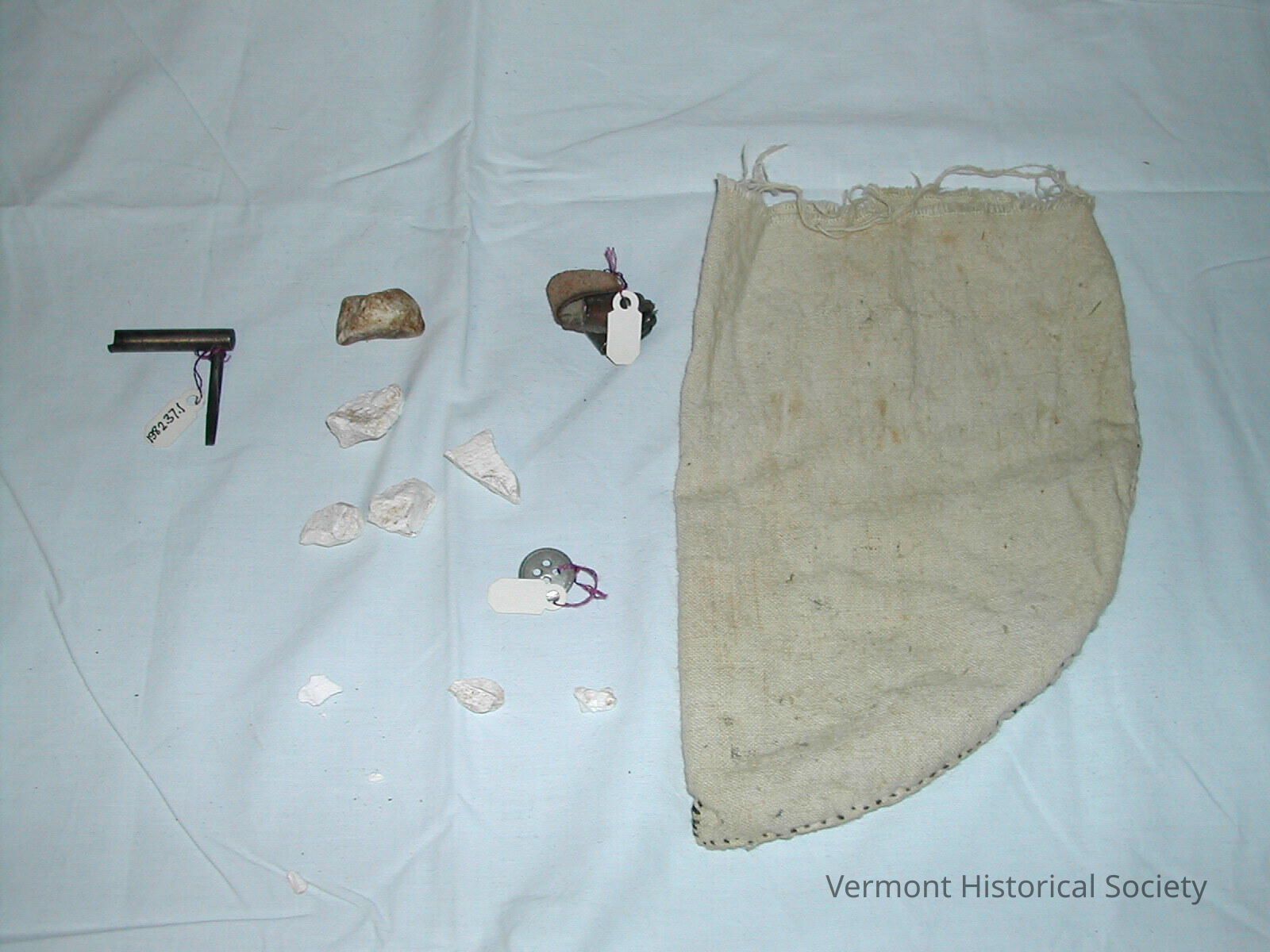 White cotton pouch filled with miscellaneous objects. The pouch is shaped like a wedge with a raw-edged opening at the top, a straight edge formed on a fold at the left, and a curved edge stitched with running stitches in black thread from the bottom of the fold to the top opening. Inside the pouch is a metal button, a buckle on a broken leather strap, a small screwdriver fashioned from a clock winding key, and several pieces of chalk.Context