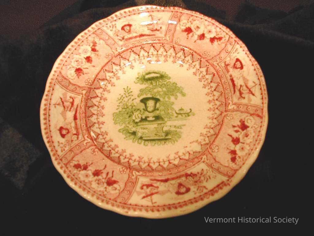 Transfer-printed plate with a green center and red border. The center shows a large urn at the side of a body of water, with a boat in the distance. The border is separated into wedges, alternating between floral bunches and a scene with an urn and a sailboat. The back is marked, "CANOVA".