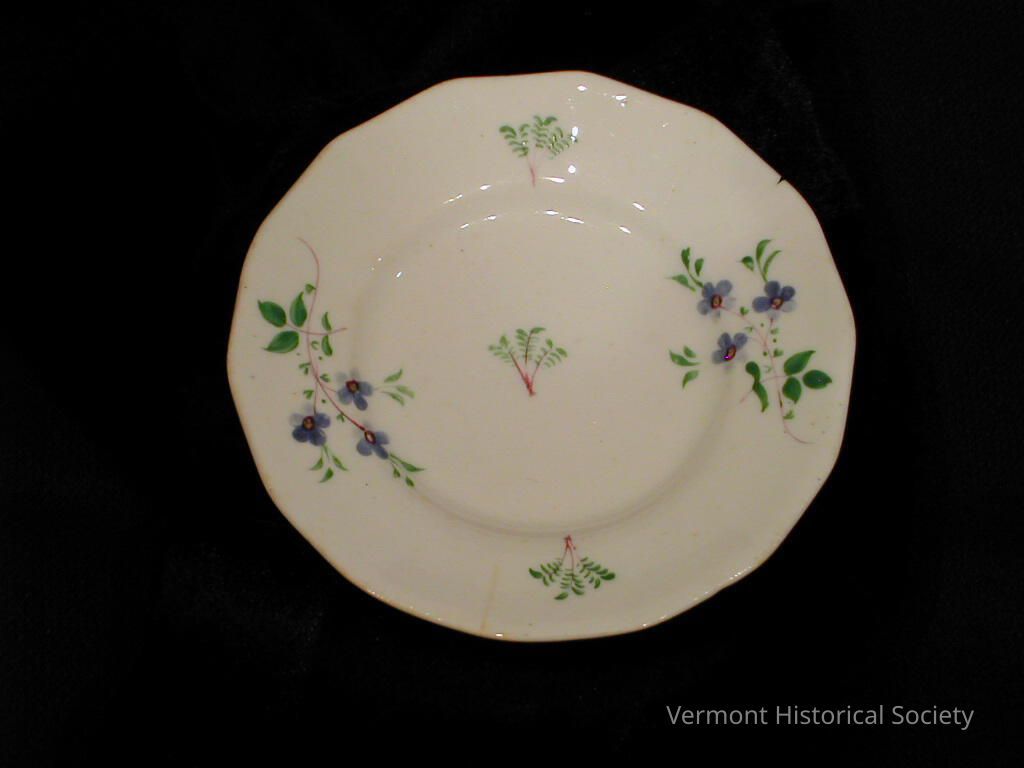 Ceramic cup plate hand painted with sprigs of leaves and flowers. The leaves are green, the flowers are purple, and the stems are red.