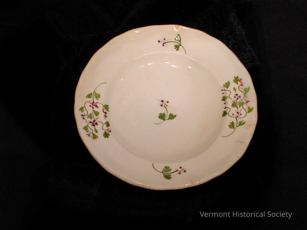 Ceramic cup plate hand painted with sprigs of leaves and flowers. The leaves are green, the flowers are purple, and the stems are red.