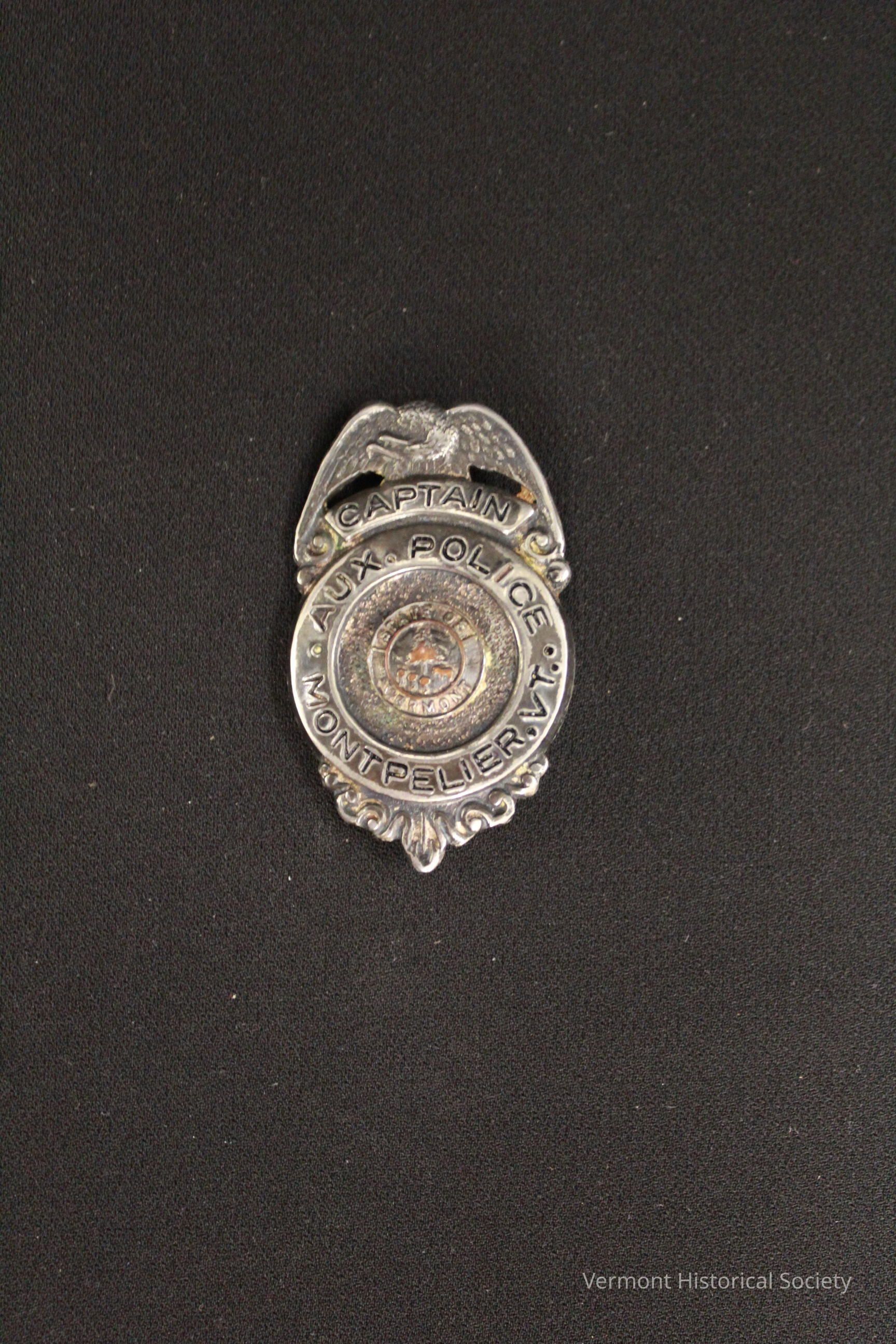 Metal police badge. The silver-colored metal badge has a rampant eagle crowning the top of a circular shield and has swirling leafy patterns at the base. The badge has a circular band made of a raised pattern which surrounds the Vermont state coat of arms. The debossed words read, “CAPTAIN / AUX. POLICE / MONTPELIER VT.” on the flat outer band of the shield. The words “STATE OF / VERMONT” encircle the coat of arms. The back of the badge has a pin on a metal hinge.Context