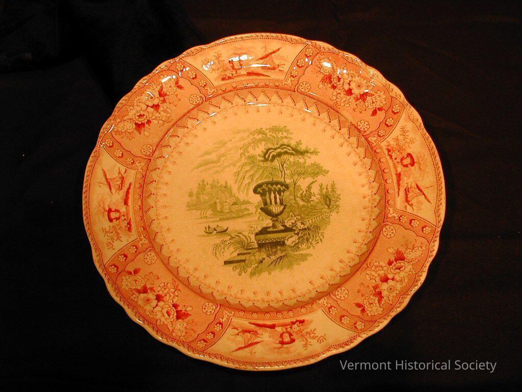 Transfer-printed plate with a green center and red border. The center shows a large urn at the side of a body of water, with a boat in the distance. The border is separated into wedges, alternating between floral bunches and a scene with an urn and a sailboat. The back is marked, "CANOVA".