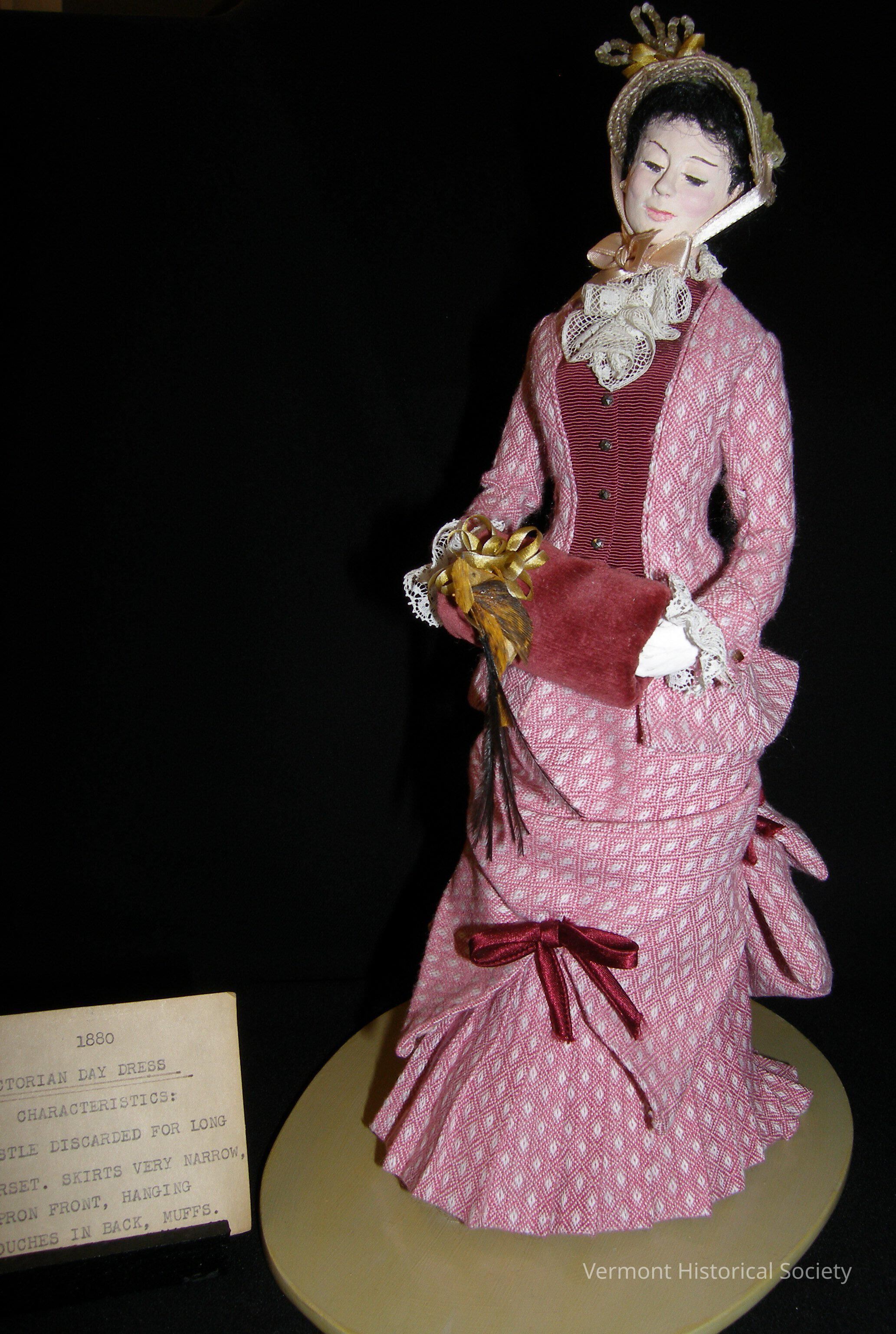 Female figure made of papier-mâché over a wire frame wearing a long pink dress. The hair is tied in a low knot at the back of her head. The hat is made of natural-colored straw trimmed with a beaded wire ornament and held on by pink silk ribbon tied in a bow under the chin. The dress is rose-colored fabric with a small white motif woven in. It has a high neck, a stand-up collar, and a lace jabot. The dark rose grosgrain fabric buttons down the front of the bodice, resembling a waistcoat. The top skirt forms a drawn-back apron front, and at the back it forms three pouches. The underskirt is full and pleated. In her hands, the figure holds a dark pink velveteen muff trimmed with a bow and a bird. Dark rose silk bows trim the dress front and sides. There is no bustle.