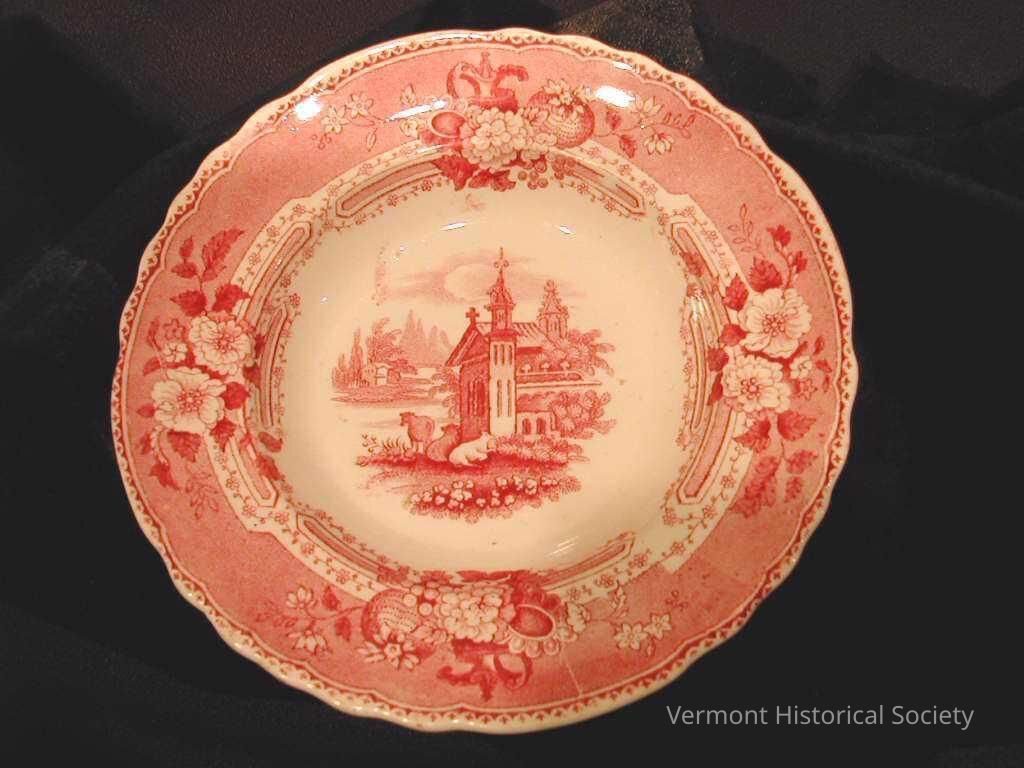 Red-and-white transfer-printed saucer with a central design showing a gothic church with cows laying beside it. The border shows bulbous flowers.