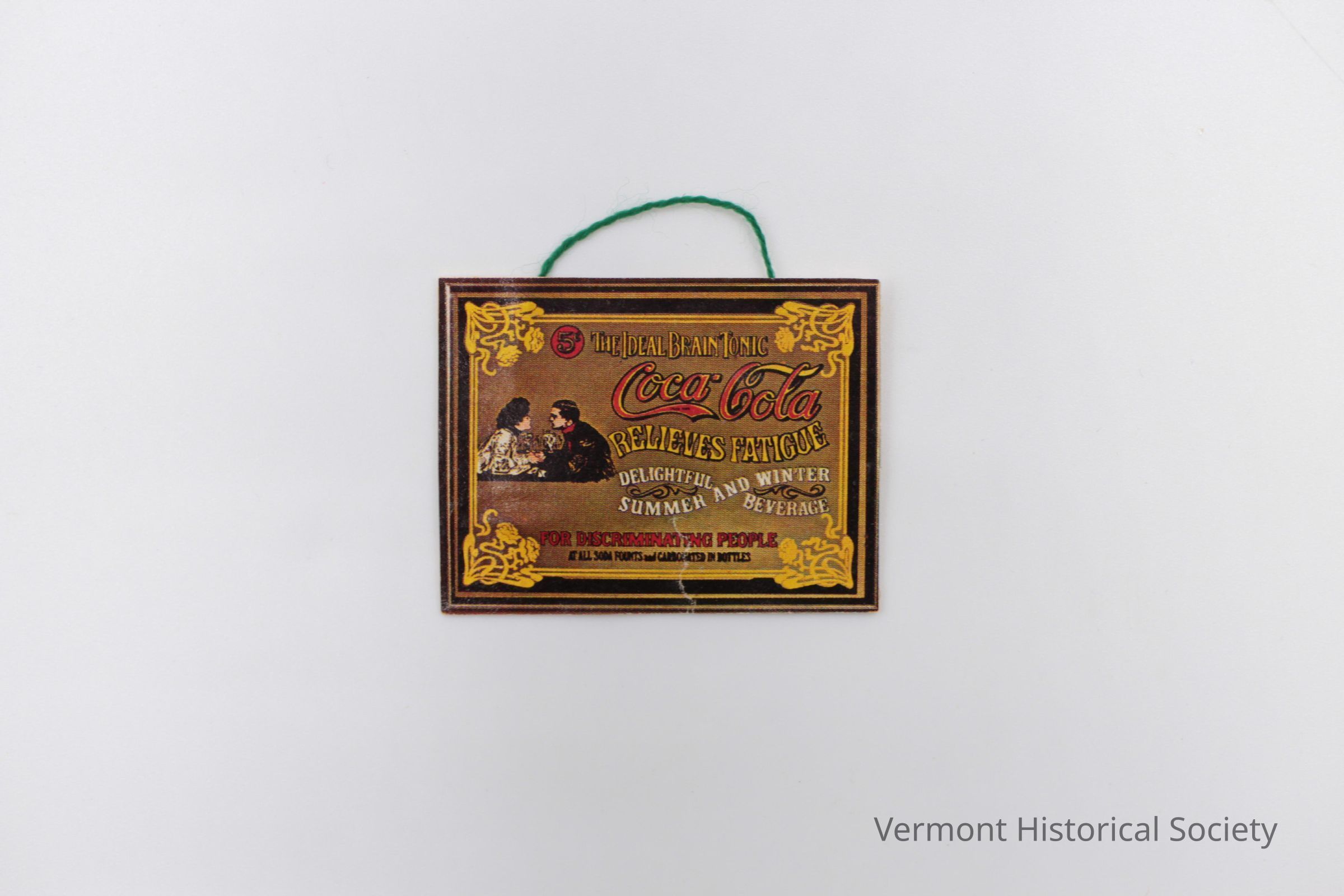Miniature wall hanging sized for a dollhouse. The piece consists of a miniature print of a Coca-Cola advertisement printed on paper that is glued to a cardboard backing. There is a loop of green thread sandwiched between the layers and extending out the top.Context