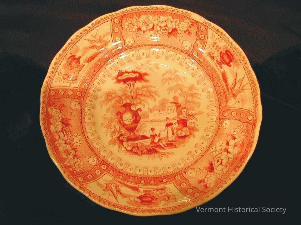 Red-and-white transfer-printed saucer. The center shows a large urn beside two figures, one playing a musical instrument. There is classical architecture in the background. The border is separated into wedges, alternating between floral bunches and a scene with an urn and a sailboat. The back is marked, "CANOVA".