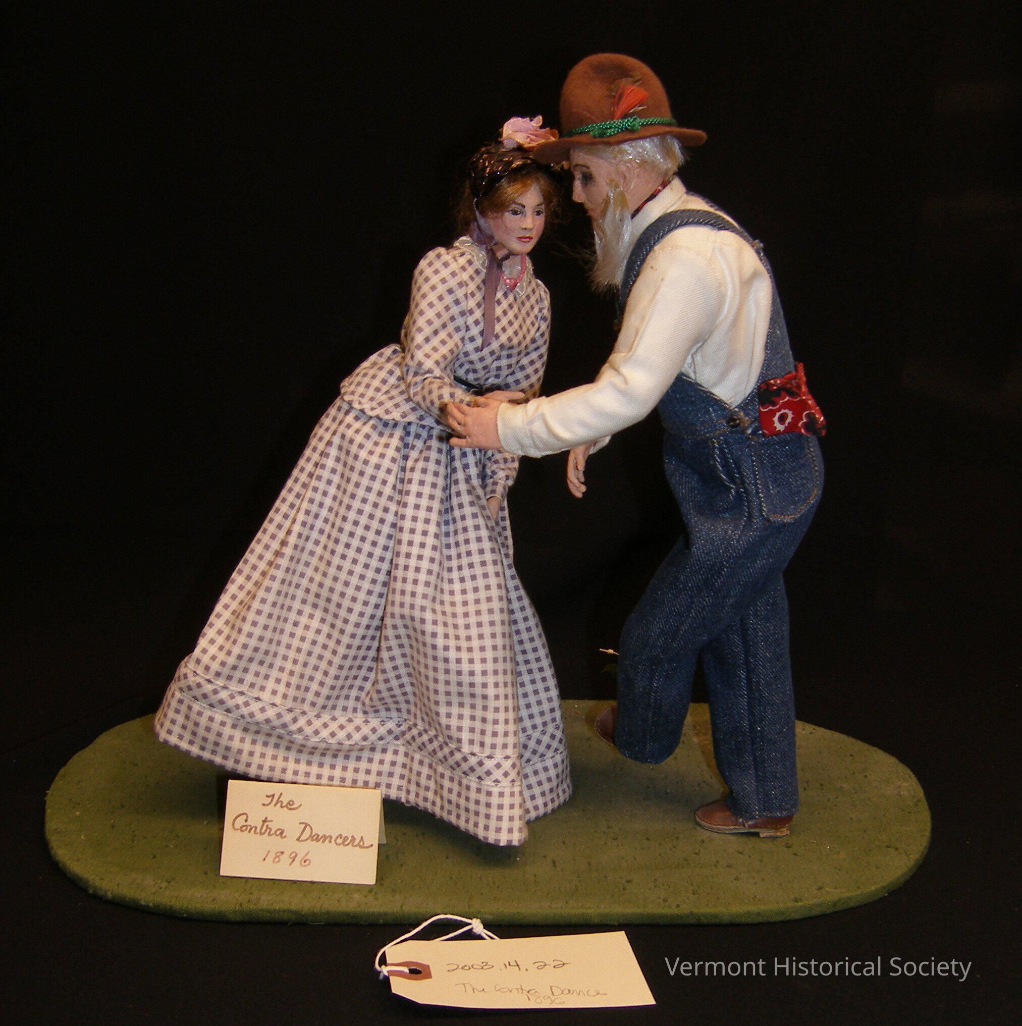 Scenic papier-mâché figure with two people, a man and a woman, dancing. The woman is wearing a white-and-purple checked dress (bodice and skirt) with a black belt at her waist. She has brown hair and is wearing a small bonnet topped with pink and white flowers. The man is wearing denim overalls and a long-sleeved white shirt. He has brown shoes, a large brown hat, and a red handkerchief in his back pocket. He has white hair and a long white beard. The figures are on a green, oval base, and there is a bifold paper label that reads "The Contra Dancers 1896".Context