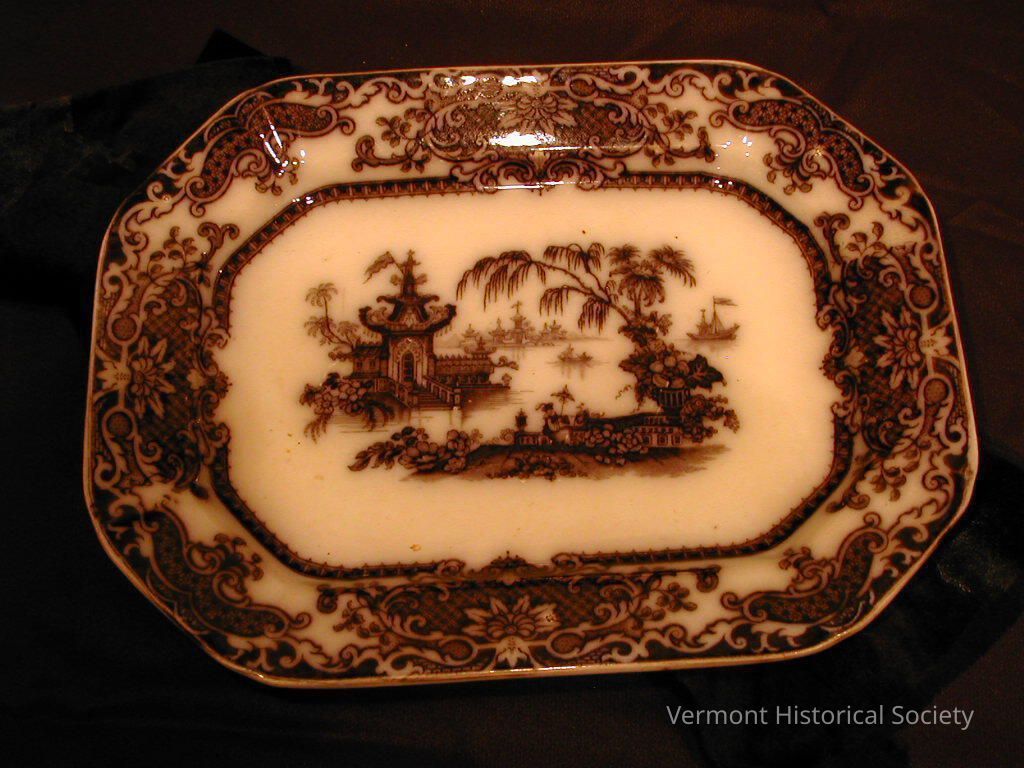 Black-and-white transfer-printed platter. The platter is printed in the center with a scenic design showing a pagoda on an island with a garden fence in the foreground. The rim is printed with a scrollwork design of cartouches.