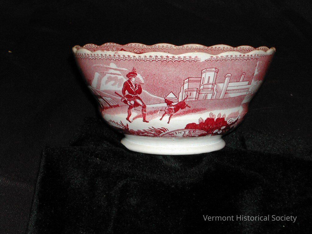 Red-and-white transfer-printed waste bowl. The bowl is printed on the interior center with a scenic design of a man and a hunting dog. They are in a landscape in front of a castle with snow-covered cottages to the right. The center bottom of the design is labeled, "WINTER". The interior border is printed with a design of bunches of fruit alternating with classical personifications of the four seasons. The exterior of the bowl is printed with the same scene at the interior center. The bottom is marked, "SEASONS".