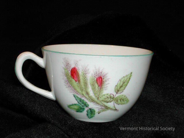 Small white ceramic teacup printed with a design of a sprig of rosebuds. The design has been hand painted in green and pink.
