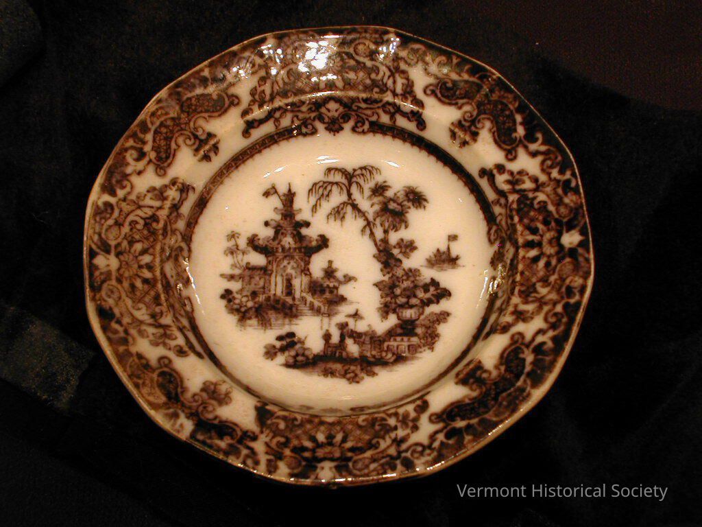 Black-and-white transfer-printed saucer. The saucer is printed in the center with a scenic design showing a pagoda on an island with a garden fence in the foreground. The rim is printed with a scrollwork design of cartouches.