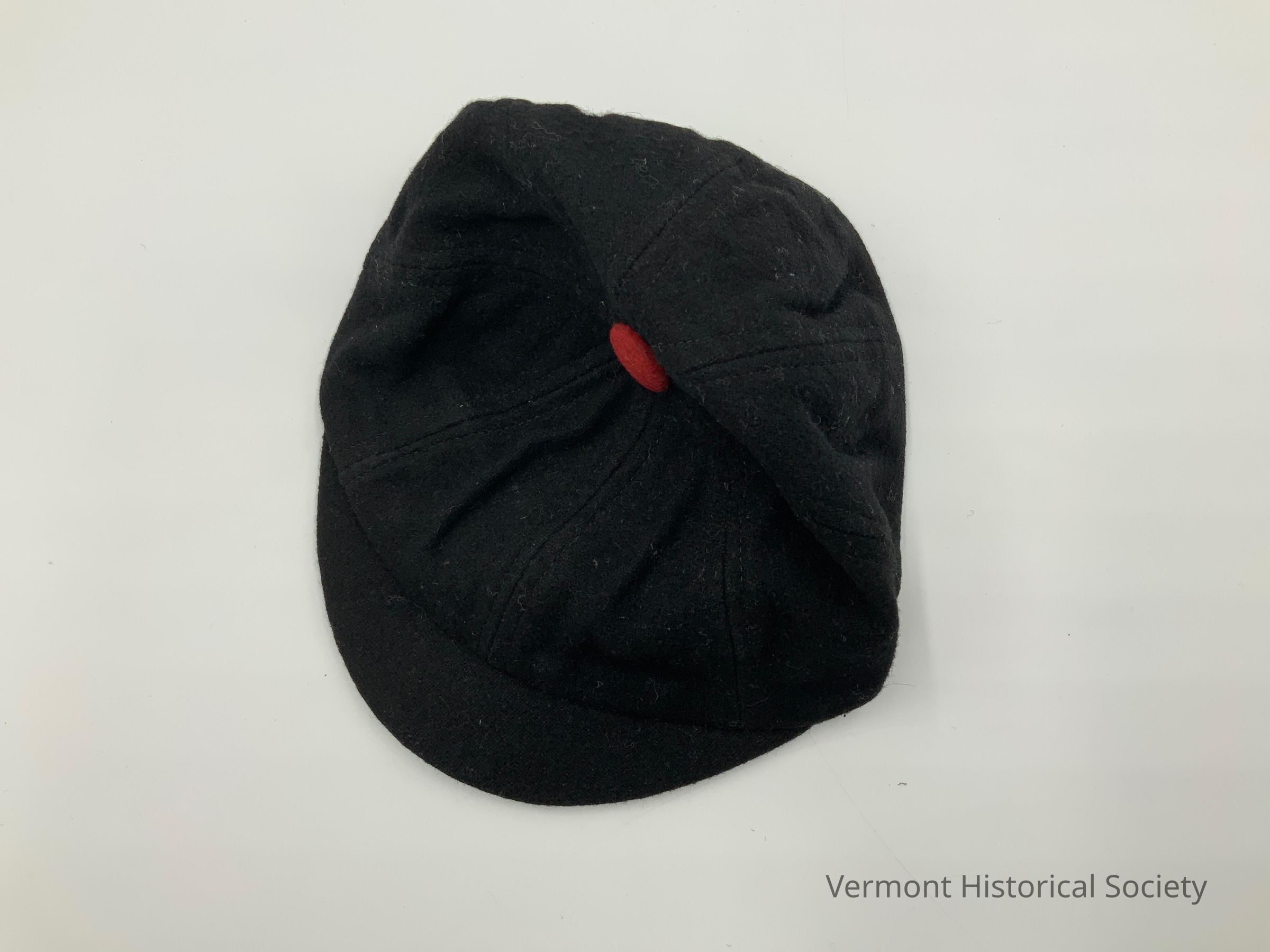 Black cap with short visor and red button on top. Leather band runs around inside, with a tiny sticker saying the size is 7.13.Context