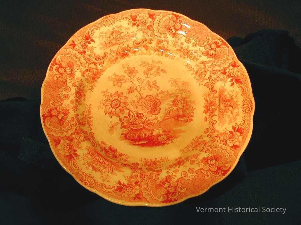 Red-and-white transfer-printed dessert plate. The center has a design of flowers sprouting from a large urn with another urn in the background. The border is separated into cartouches showing pagodas because flowers and scrollwork. The back is marked with a sailing ship and the words, "JAPAN / RMW&CO / FLOWERS".