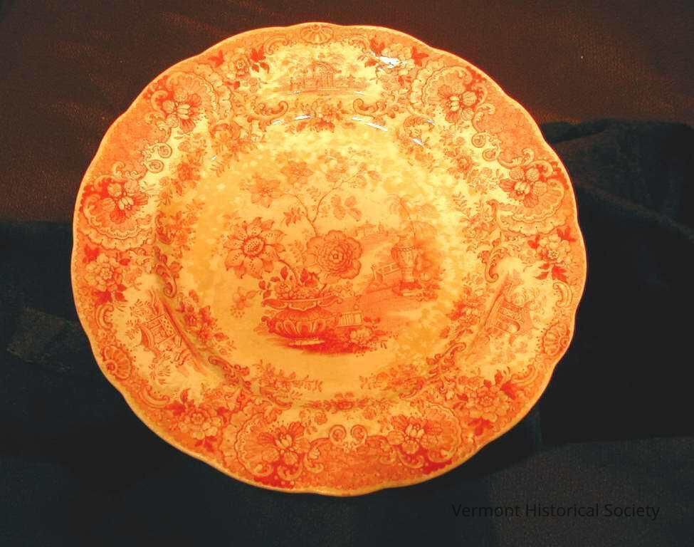 Red-and-white transfer-printed dessert plate. The center has a design of flowers sprouting from a large urn with another urn in the background. The border is separated into cartouches showing pagodas because flowers and scrollwork. The back is marked with a sailing ship and the words, "JAPAN / RMW&CO / FLOWERS".