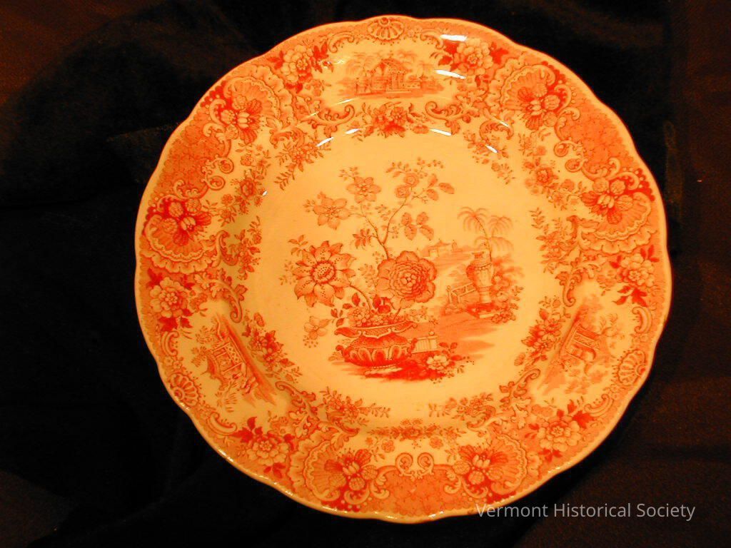 Red-and-white transfer-printed dessert plate. The center has a design of flowers sprouting from a large urn with another urn in the background. The border is separated into cartouches showing pagodas because flowers and scrollwork. The back is marked with a sailing ship and the words, "JAPAN / RMW&CO / FLOWERS".