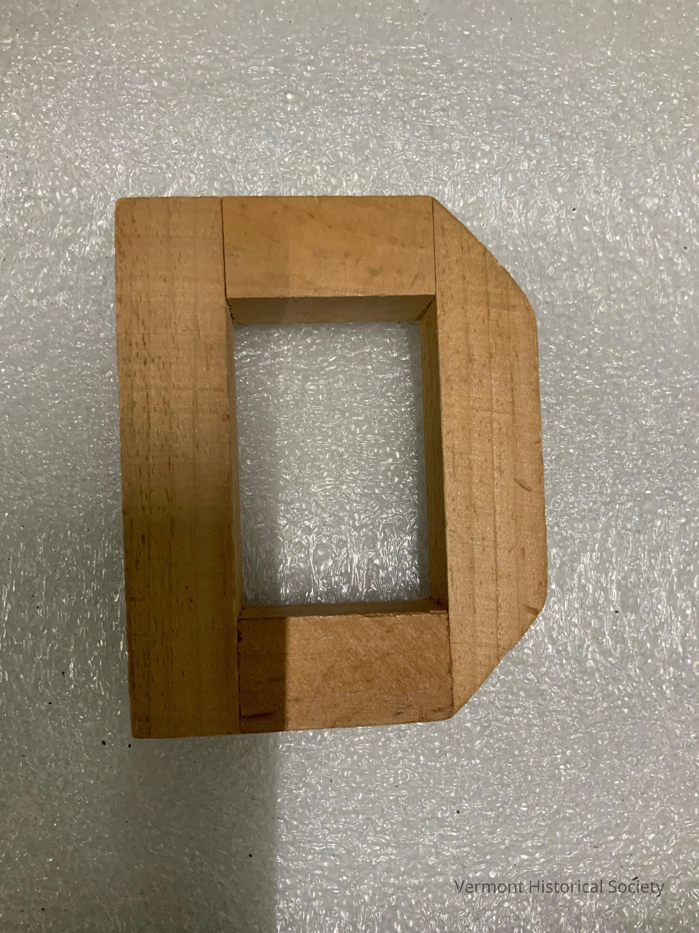 Wooden block in the shape of the letter D.