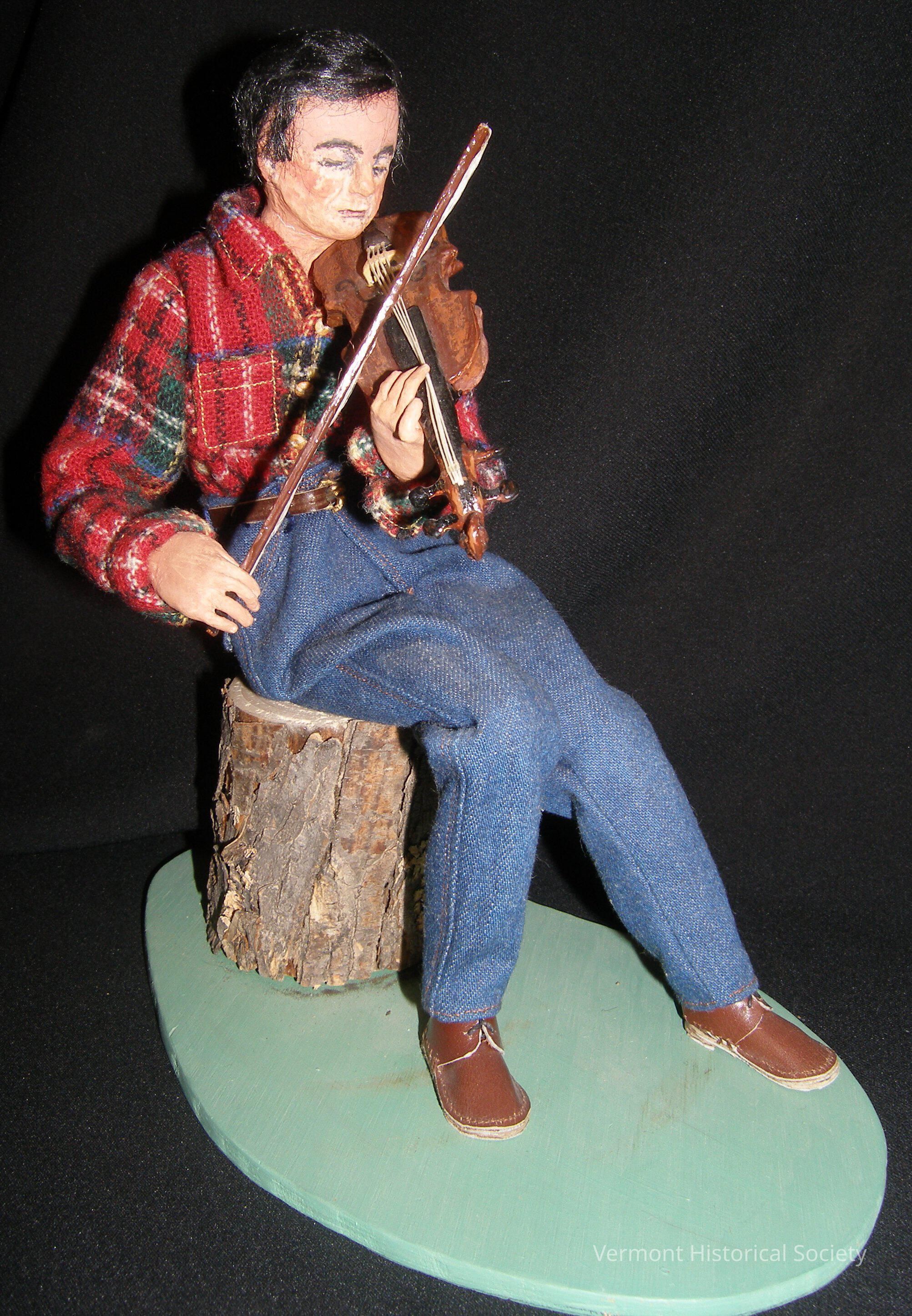 Male figure made of papier- mâché over a wire frame wearing a red plaid wool shirt, blue denim pants, and brown leather shoes. He is shown sitting on a tree stump playing a fiddle.