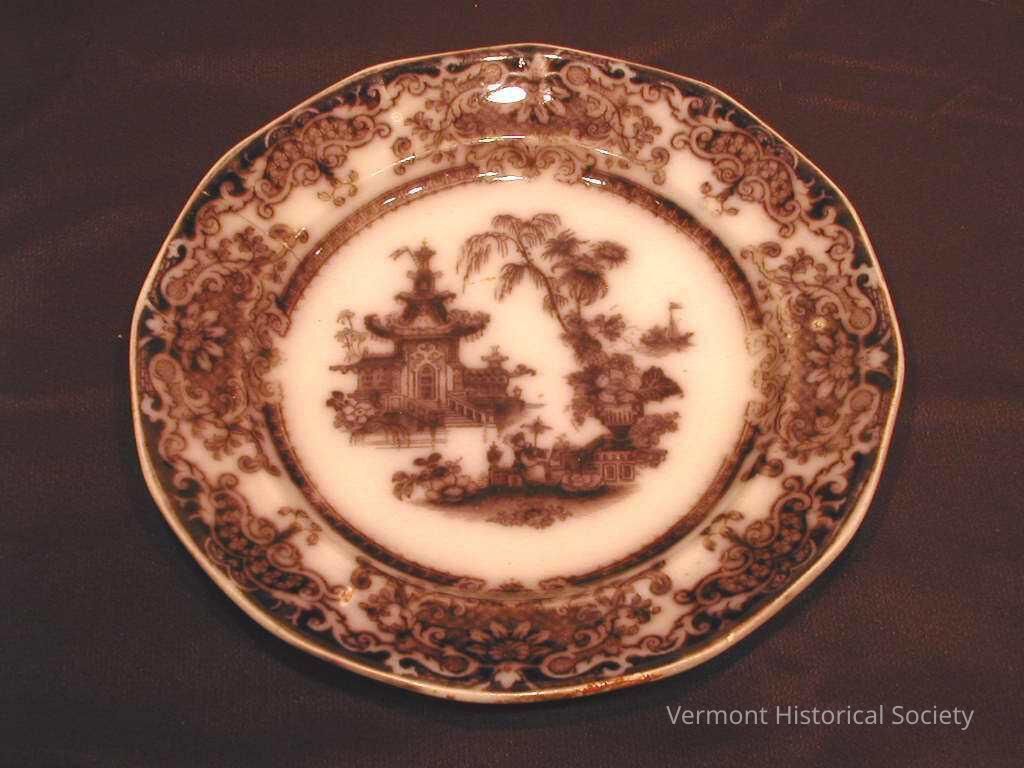 Black-and-white transfer-printed plate. The plate is printed in the center with a scenic design showing a pagoda on an island with a garden fence in the foreground. The rim is printed with a scrollwork design of cartouches.