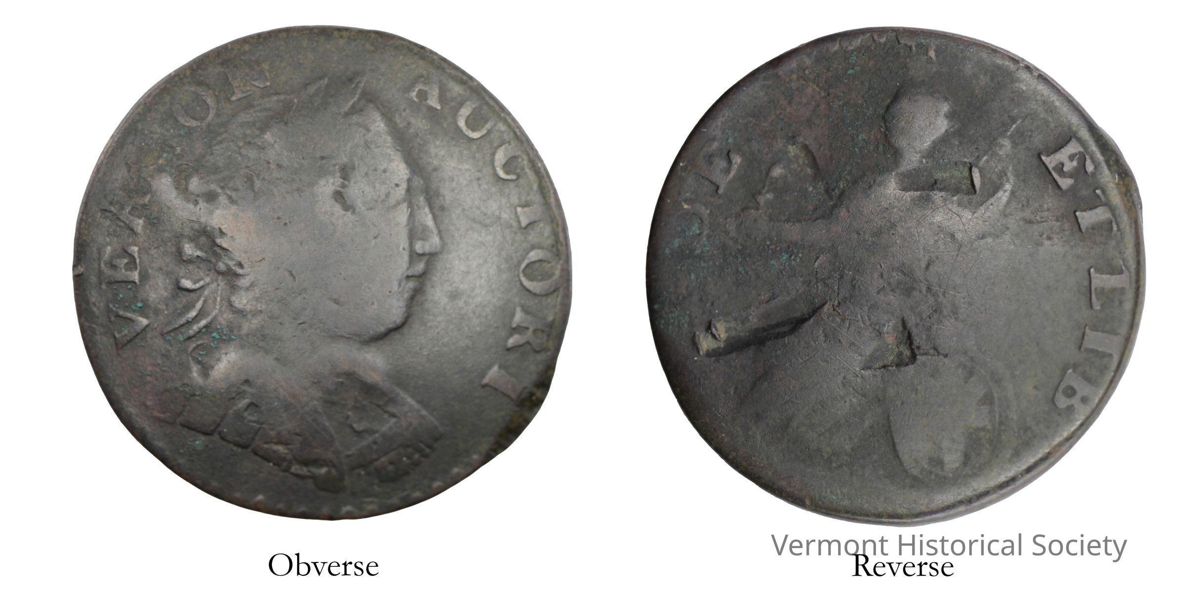 Copper coin with a bust on one side and the allegorical figure, Columbia, on the other. The face side shows a right-facing bust of a Roman figure, wearing a laurel wreath on his head, tied with a ribbon at the nape of his neck, and military armor. The words "VERMONT AUCTORI" ring the edge. On the reverse, Columbia is shown swathed in loose fabric, seated next to a shield bearing the Union flag. She is holding a staff with a liberty cap in her left hand, and a small branch in her right hand. The words, "INDE ET LIB" ring the edge. The face side has rubbed smooth, losing fine detail, and the reverse has rubbed almost completely smooth, with only the vague outline of Columbia left.Context