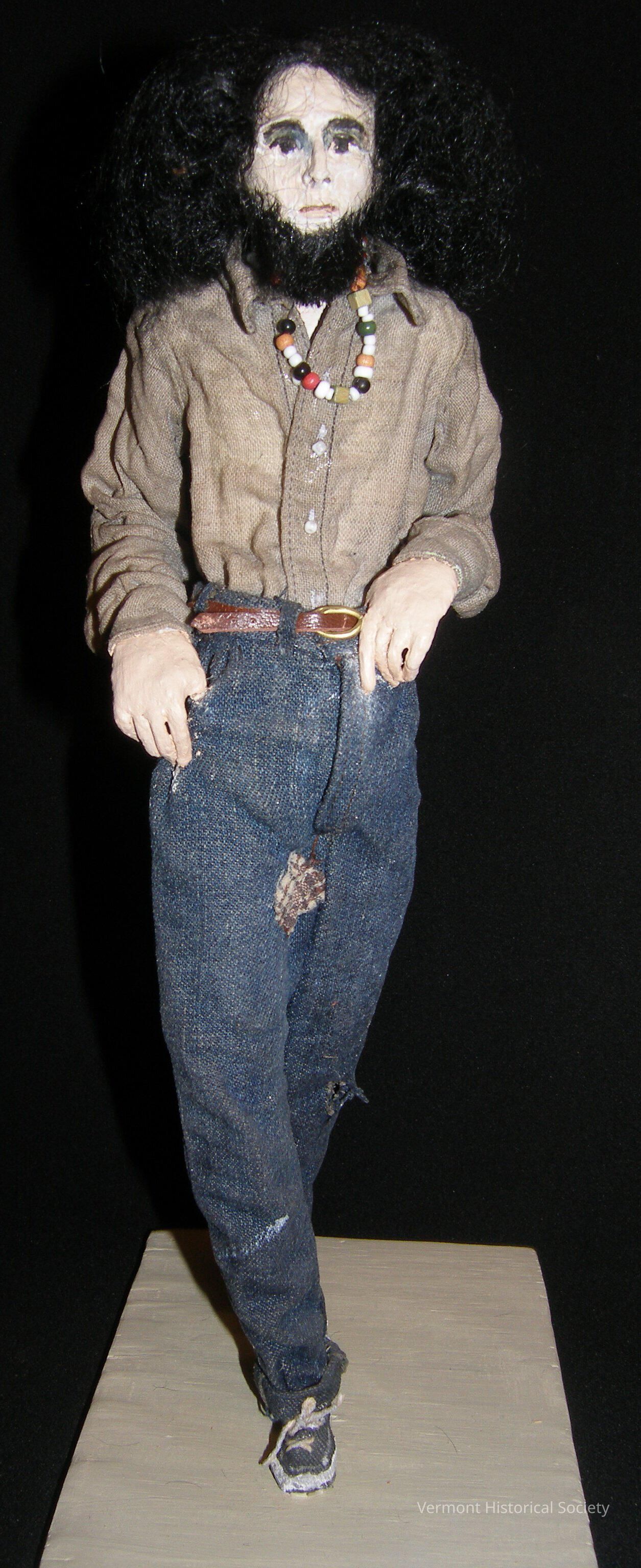 Male figure made of papier-mâché over a wire frame wearing a brown cotton shirt, blue denim pants, and tennis shoes. The figure has black wool glued to its head to have long, unruly black hair and a long black beard. His is wearing a beaded necklace. There are brown plaid patches on his pants. The pants are held up by a brown leather belt.