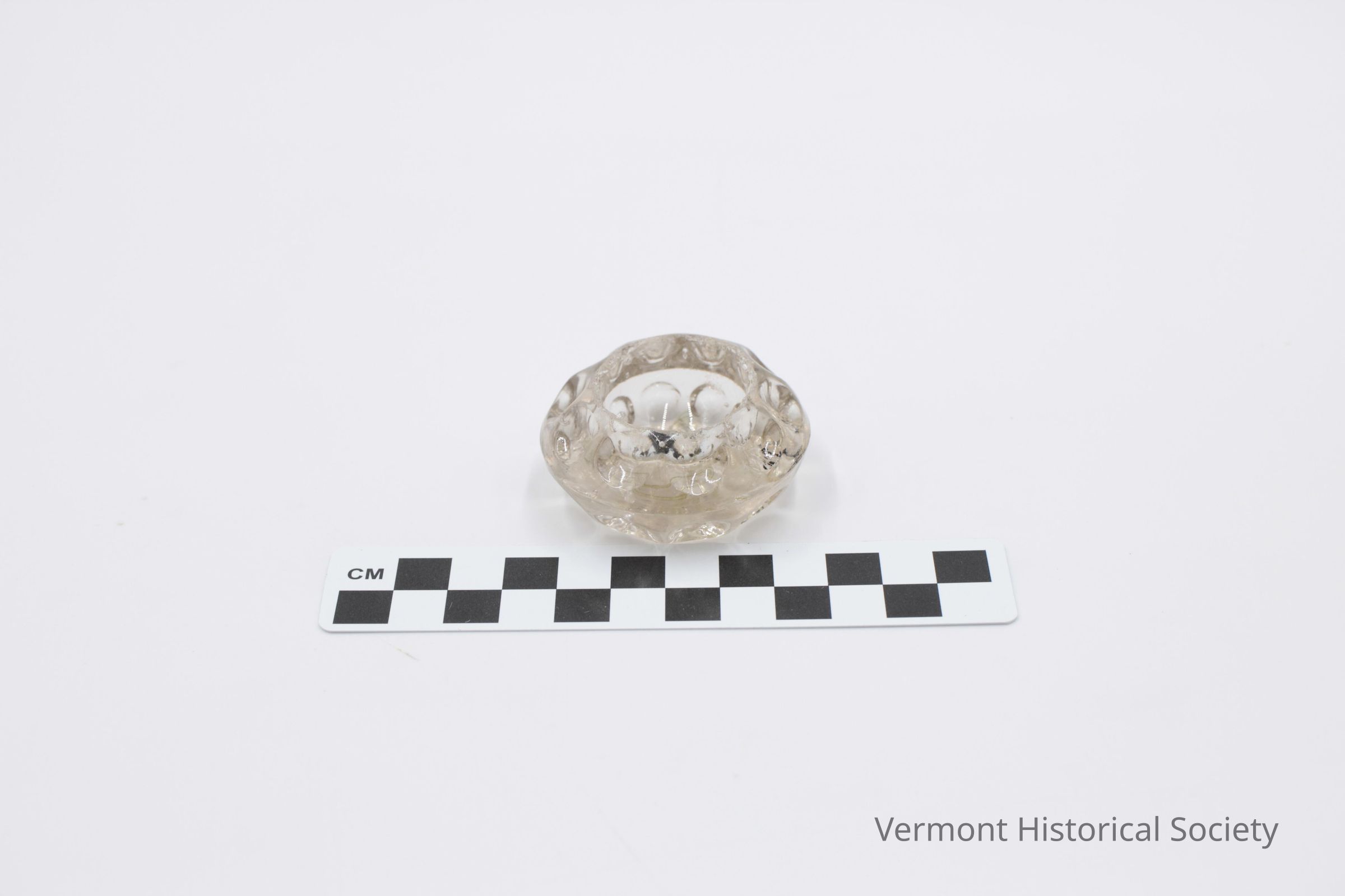 Four diminutive glass saltcellars. Each is round with oval divots molded around the sides and a starburst molded into the bottom center.